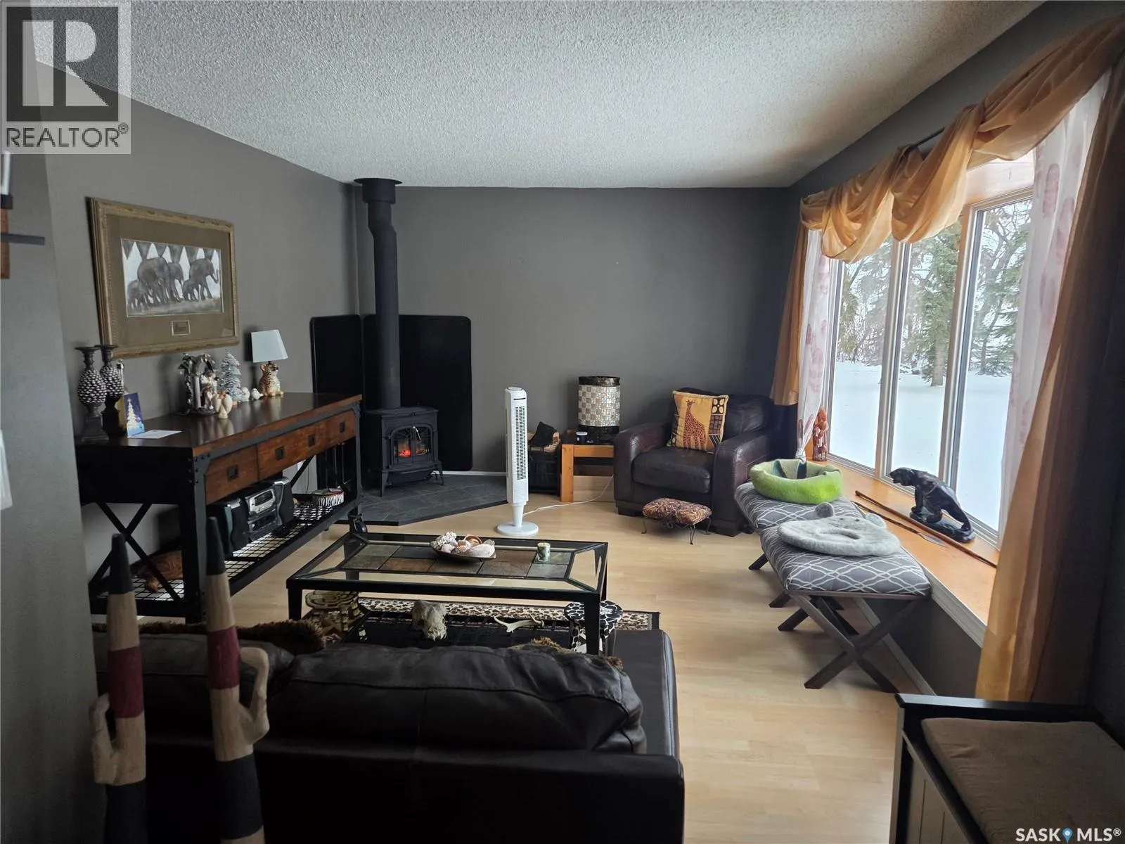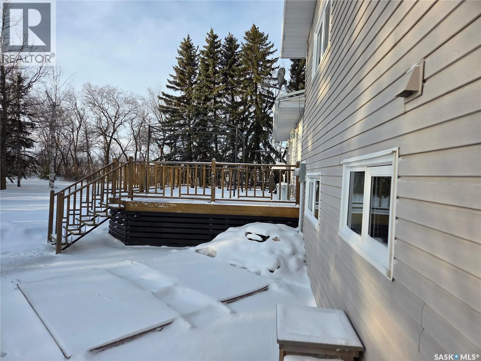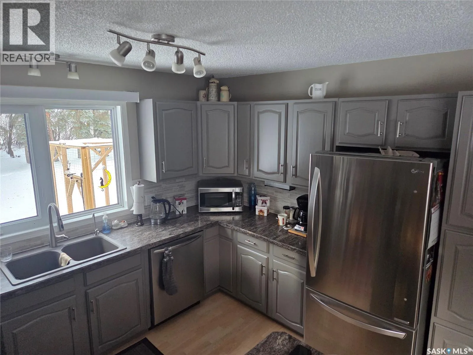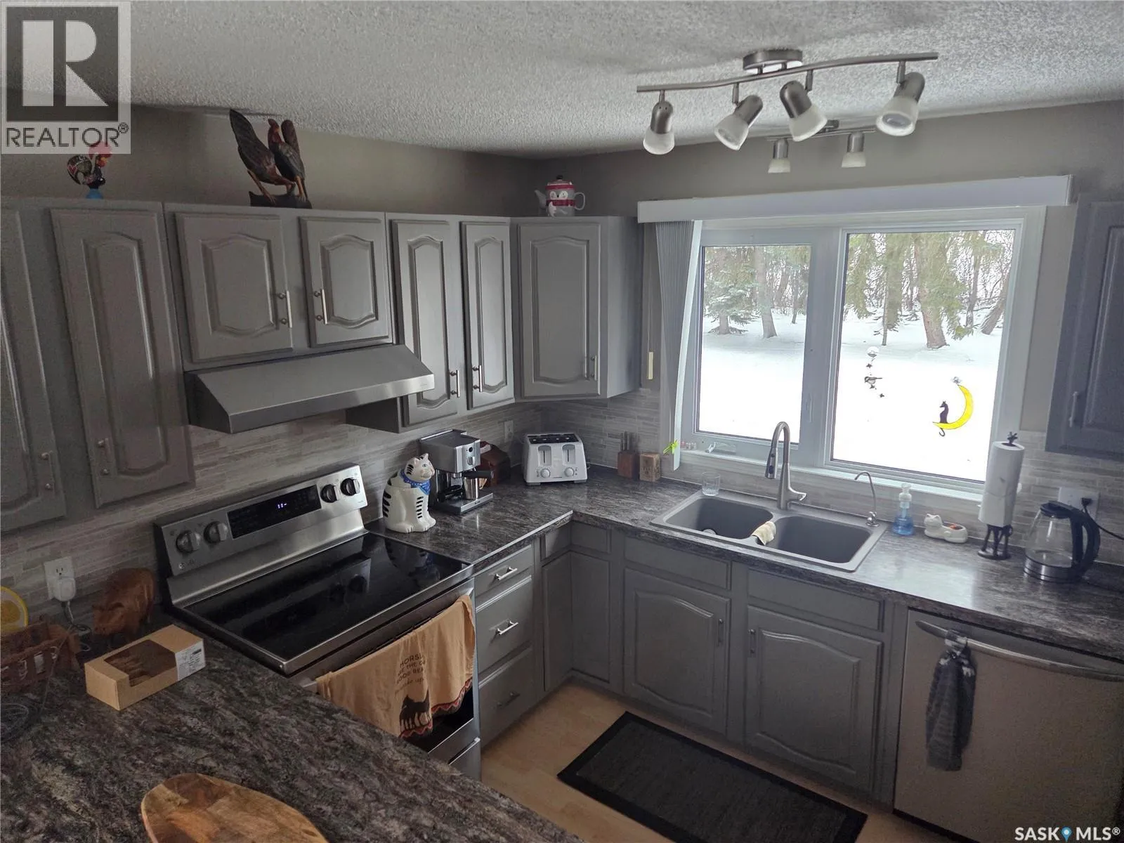 2 miles west and 3 miles north of Tisdale Welcome to the perfect acreage to fit anyone's needs. 5 bedrooms, 2 bathrooms, 3 living areas and plenty of storage on this 4 level split just a short 8kms from the heart of Tisdale. 3.72 acres enclosed with in a complete shelterbelt with a large storage shed, 20x30x12 tarp shed, garden area and tree house for the little ones. Large deck with covered gazebo off the back entrance, year round fish pond with fish along the patio entrance to garage, enclosed CATIO for the cats with separate house entrance and a 2 car 30x24 attached garage with built in cabinets and electric plug in heater. All appliance except bar fridge and basement freezer included (stove and hood fan new) as will the couches and electric fireplace in the basement, bed in first upper bedroom, lawn sweep and garden tiller. Sewer is by septic tank with pump out to south east, water is rural pipeline, 200 amp panel box. Sump pump pumps out far behind garage. Many many upgrades in the past years make this home ready to move in and live the life. (id:27476)