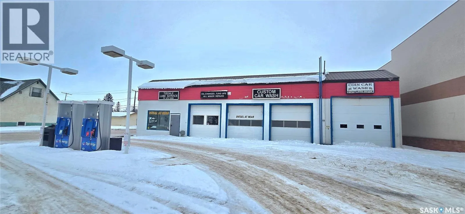 Prime downtown opportunity located on Main Street in Tisdale. This versatile commercial property has previously operated as a car wash, gas station, lube and repair shop, and custom cleaning business, offering excellent redevelopment or re-use potential. Strategically positioned with strong visibility and access in the heart of the community. The area is further supported by growing regional activity, including proposed aluminum mining developments planned near the town, which may contribute to future economic growth and increased demand. An ideal opportunity for investors, owner-operators, or developers seeking a well-located asset in an established downtown core. The original 56' x 30' building includes a two-bay service shop equipped with two hoists, making it ideal for a mechanic or automotive operator. An additional two-bay car wash totals approximately 1,020 sq. ft. A comprehensive list of equipment is included in the sale. The business currently have a Esso brand. Constructed in the 1960s, the original building features concrete block walls and a metal roof. The car wash bays, built in 1999, are wood-frame construction and fully metal-clad inside and out. The site includes a concrete front pad and fuel island, owned sign frames, two washrooms, an office/waiting area, ample storage, and generous on-site parking. An excellent opportunity for owner-operators or investors seeking a versatile, income-producing commercial property. Owner financing or lease option is available for the qualified purchaser. (id:27476)