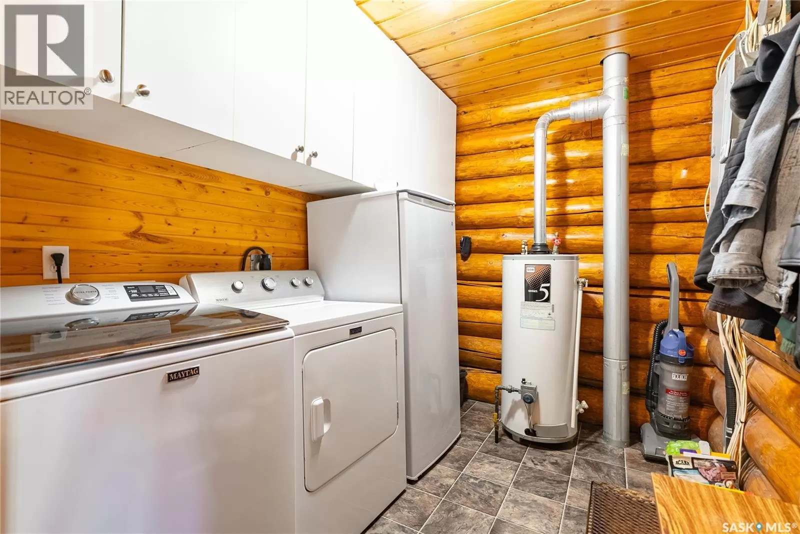 Stunning Log Home on Dream Acreage! This exceptional log home is ideally located just 11 km from Nipawin, nestled on 5 picturesque acres that back onto crown land and are only 2 kilometers from the river. Itâs a perfect haven for outdoor enthusiasts, whether you enjoy golfing, fishing, hunting, quadding, or skidooing. The property features a beautiful log home with a vaulted ceiling as you enter into this home through the garden doors that open to an inviting great room, where you can soak in gorgeous views and cozy up by the gas fireplace with a cup of hot chocolate. The U-shaped kitchen is equipped with newer stainless appliances, abundant cabinets, and bar stools, making it great for entertaining guests. On the main floor, youâll find a spacious primary bedroom with ample closet space, a luxurious 4-piece bath featuring a jacuzzi tub and separate shower, as well as convenient laundry and additional storage. Upstairs, a huge loft offers the potential for two additional bedrooms or can serve as a spacious TV/recreation area or office. Additionally, thereâs a 32 x 40 heated shop with a 14-foot overhead door for all your hobbies and projects. The outdoor space includes a large fountain surrounded by rocks, creating a serene retreat. This rare and one-of-a-kind property was built in 2000. Donât miss your chance to own this dream acreageâact now and make it yours! One shed is excluded. (id:27476)