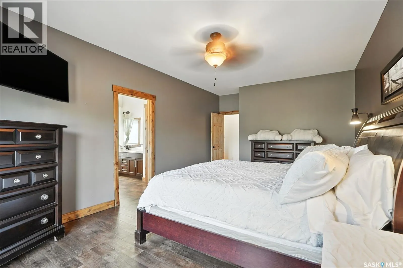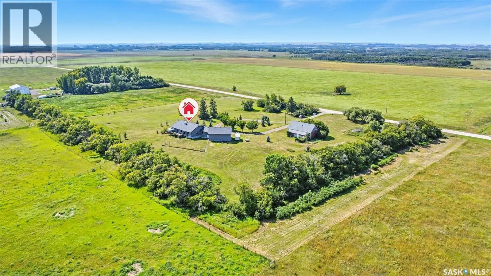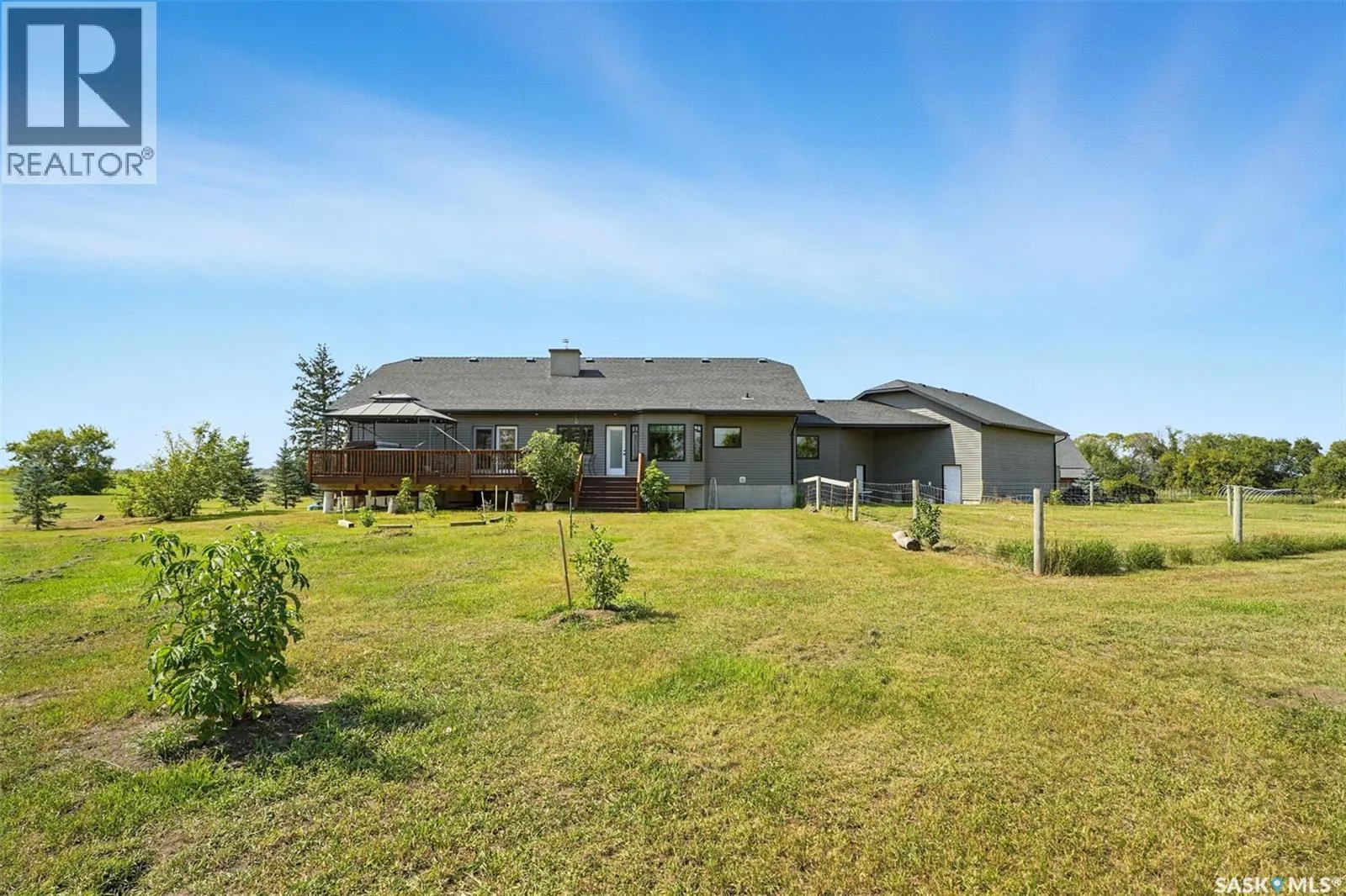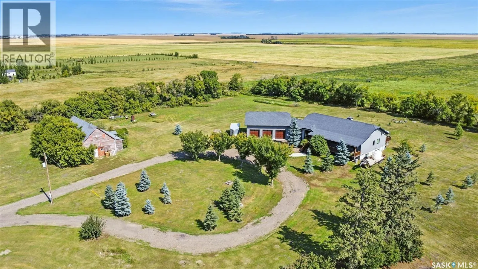 Just south of Vanscoy, and only a short drive from the city, this stunning 2,514 sq. ft. custom home sits on 8.86 acres in a beautifully mature yardsite. Designed with ease of living in mind, it combines rural tranquility with modern luxuryâperfect for those looking take a break from the city without sacrificing comfort and quality. The main floor offers true one-level living with 3 spacious bedrooms and 3 baths, including a spa-inspired ensuite with a custom tile shower and jacuzzi tub. Wide 4-ft hallways, solid pine doors, and thoughtful layout make the home easy to move through, while large windows fill the space with natural light. A cozy wood-burning fireplace framed in granite stone with a live-edge mantle brings warmth and charm. A chefâs kitchen awaits with cherry wood cabinetry, quartz countertops, and high-end appliances including a Thor 6-burner gas range, Wolfe hood fan & Miele dishwasher. The oversized laundry room provides abundant storage and organization, keeping daily routines hidden and stress-free. The ICF basement with 9-ft ceilings is nearly complete and ready for your personal touchâfamily recreation room, home theatre, fitness space, 2 more bedrooms & bathroom. In-floor heating lines are already in place should you prefer a radiant heat. Outdoors, enjoy expansive front and back decks with timber accents. A luxury saltwater hot tub invites you to unwind, and a convenient dog run right out the back door makes life easier for pet owners. The oversized triple-car garage provides plenty of space for any need. A large barn adds versatilityâequipped with furnace, water, kitchen, bath, and loft with bedrooms and a family room. Itâs perfect for extended family visits, ranch hand, or hobbies, with the option to convert for animals if you choose. Additional energy highlights include triple-pane windows, spray foam insulation for efficiency & upgraded fixtures. Create your legacy hereâwhere comfort, practicality, and rural beauty come together. (id:27476)