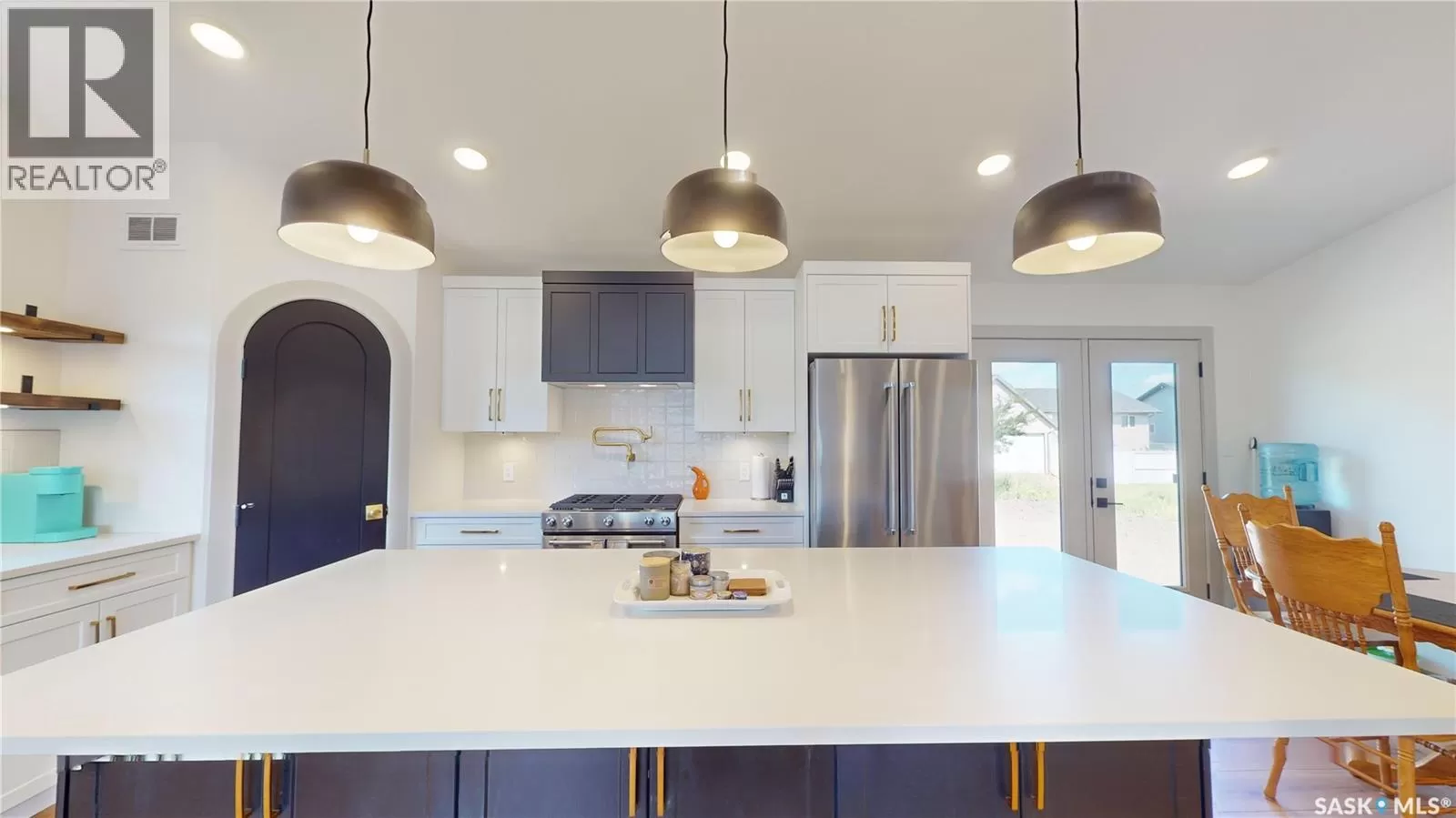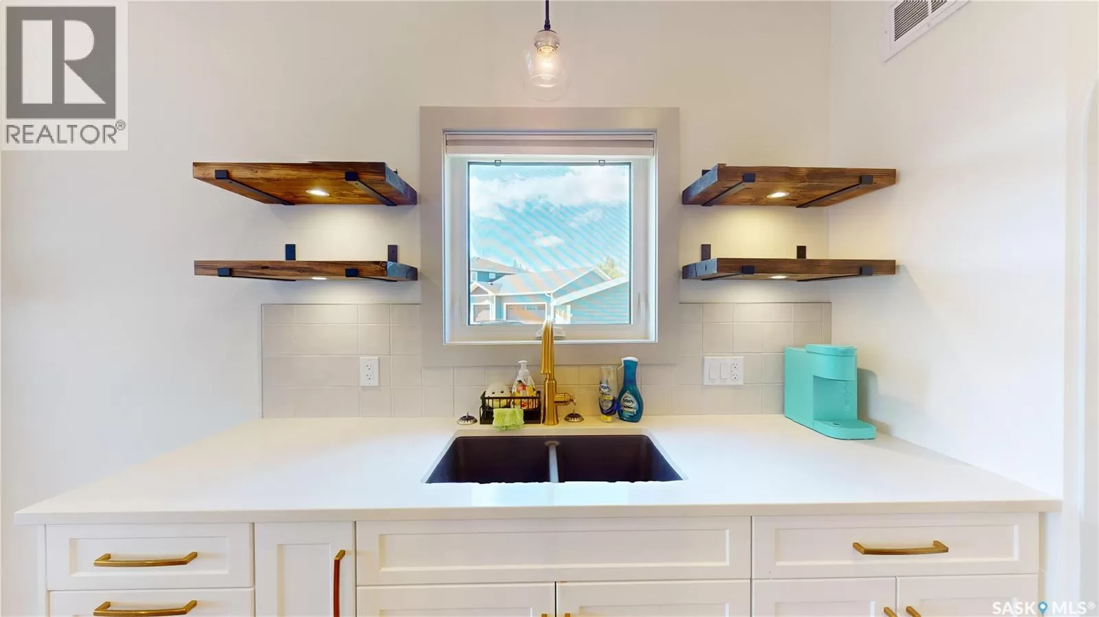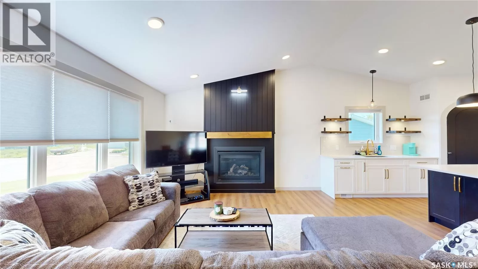 Welcome to a more relaxed and enjoyable lifestyle in the wonderful and safe Town of Waldheim where this stunning raised bungalow on a 60'x140' lot with an attached garage awaits you. 2 bedrooms on the main floor allow for a wonderfully spacious open concept in this 1,241 square foot home with a gorgeous two-tone kitchen. High-end finishes such as quartz countertops with an eating ledge, an attractive tile backsplash, a gas range, and a stylish pot-filler will make meal prep and entertaining a pleasure. Vaulted ceilings float above the kitchen and living room where a warm gas fireplace will keep you warm. The primary bedroom has a beautiful 3pc ensuite with a large tiled shower and an oversized walk-in closet and laundry service. There's a head start on the basement development where a 3rd bedroom is almost complete and the outside walls are boarded. Large windows, and rough-ins for a 3rd bathroom and a 2nd laundry service provide loads of potential in the lower level. A huge double garage has direct entry to the home and high ceilings for additional storage options. Other extras include a corner kitchen pantry with custom round-top door, central air conditioning, front and back top-soil, a Heat Recovery Ventilation system for premium air quality, double garden doors to the future deck, and more. Call now for your own private viewing! (id:27476)