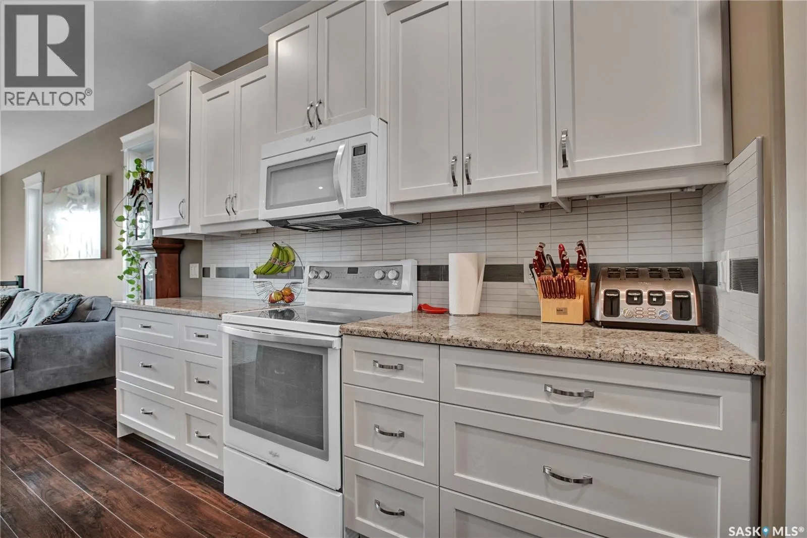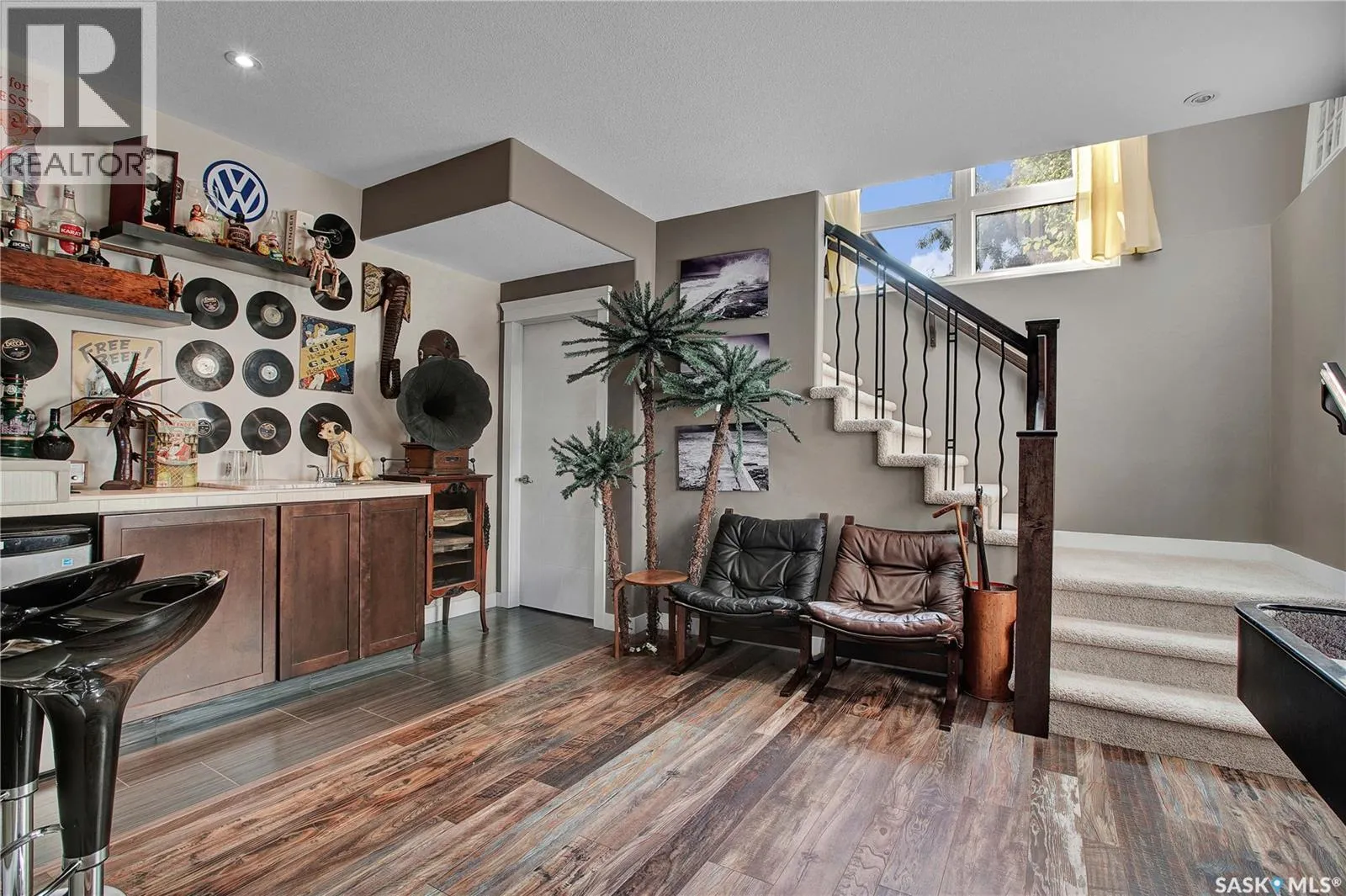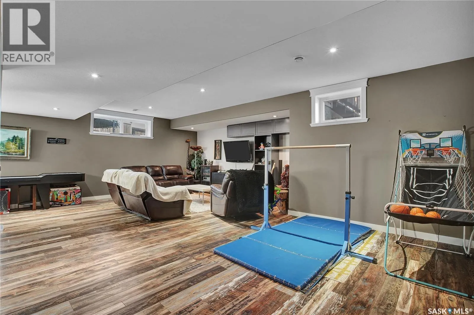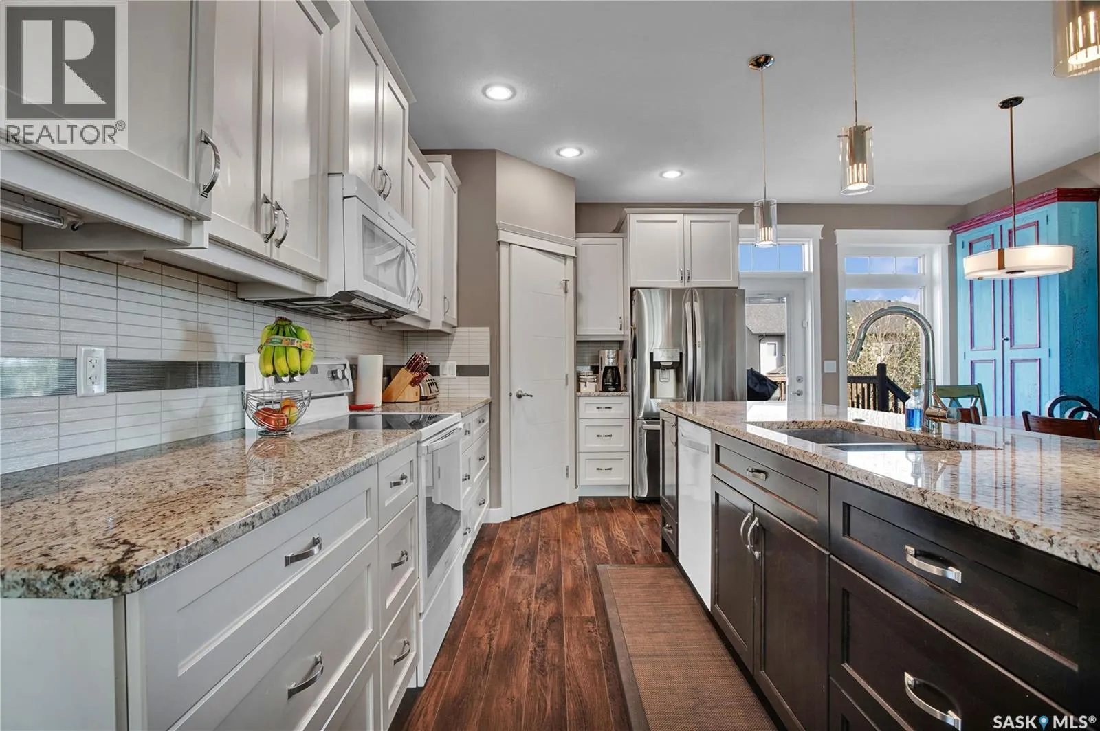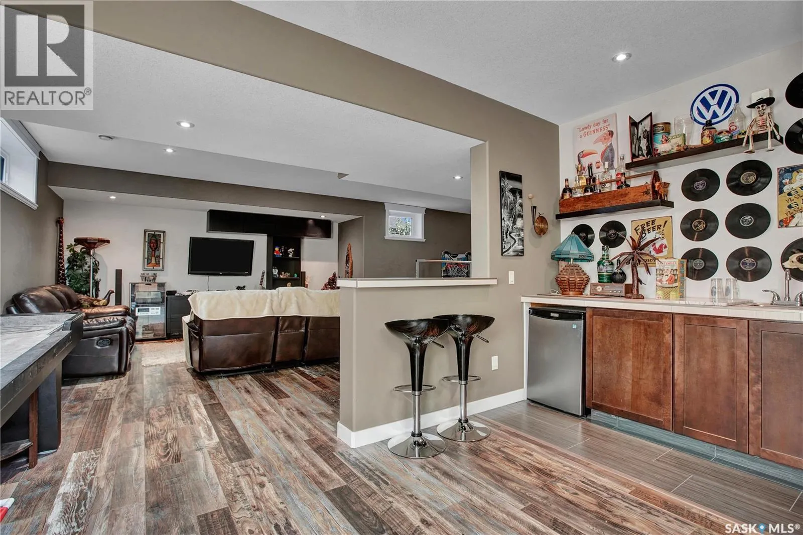 Welcome home to this immaculate 1,316 sq. ft. 4-bedroom, 3-bathroom bungalowâfully finished top to bottom and beautifully maintained throughout. The main floor offers a bright, open layout with a spacious living room featuring rich laminate floors and maple railings with metal spindles. The timeless two-tone kitchen includes granite countertops, tile backsplash, a large eat-up island, walk-in corner pantry, and under-cabinet lighting. The dining area easily accommodates large gatherings and includes a glass patio door to the back deck, plus transom windows that fill the space with natural light. Down the hall, the primary suite awaits with an upgraded drop-soffit ceiling, walk-in closet, and a 3-piece ensuite with custom tiled shower. Two additional bedrooms and a full 4-piece bathroom with tile floors and granite countertops complete the main level. The basement was designed for entertaining. A fantastic wet bar area features built-in cabinetry, bar fridge, and a raised seating peninsula. The massive family room is perfect for hosting game nights, movie nights, or setting up your home theater, and the adjoining games area offers plenty of room for a pool table or poker table. Youâll also find a large bedroom, another full 4-piece bathroom, and a spacious laundry/storage/utility roomâplus extra storage under the stairs. Outside, this property sits on a huge inside-corner, irregular lot with ample room for a trampoline, play structure, firepit, and more. Enjoy relaxing on the back deck with plenty of open views behind you looking out towards the golf course. Additional highlights include central A/C, HRV, an extra-wide concrete driveway, and an oversized 26âx26â attached garage that is fully insulated and drywalled. Upgraded bungalows like this are a rare find in Warmanâthis one shows 10/10 and is ready for its next owners. Contact your favourite Realtor today to book a private viewing! (id:27476)