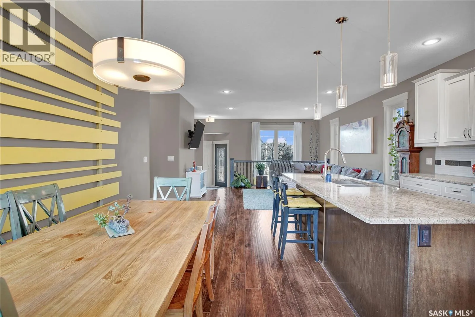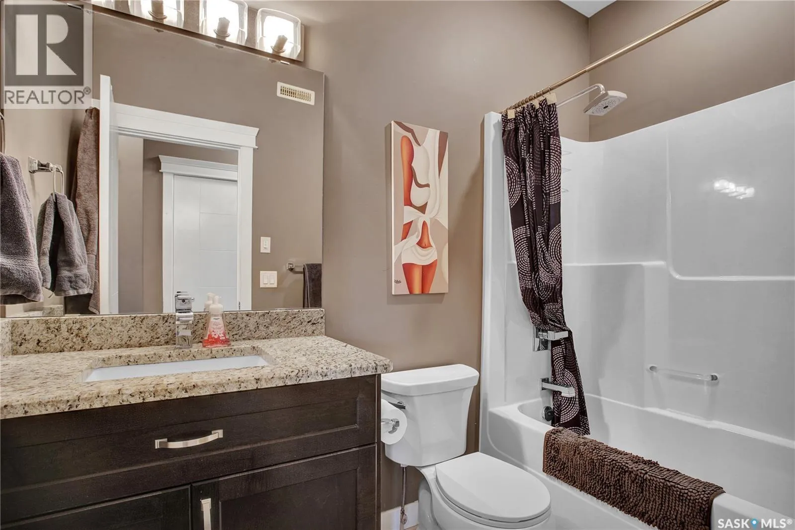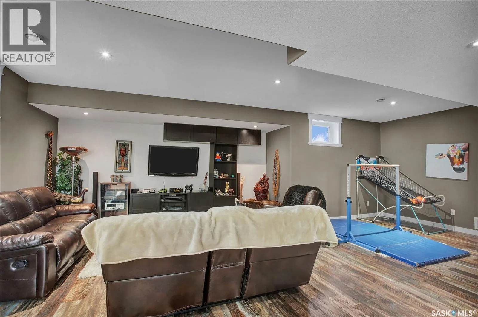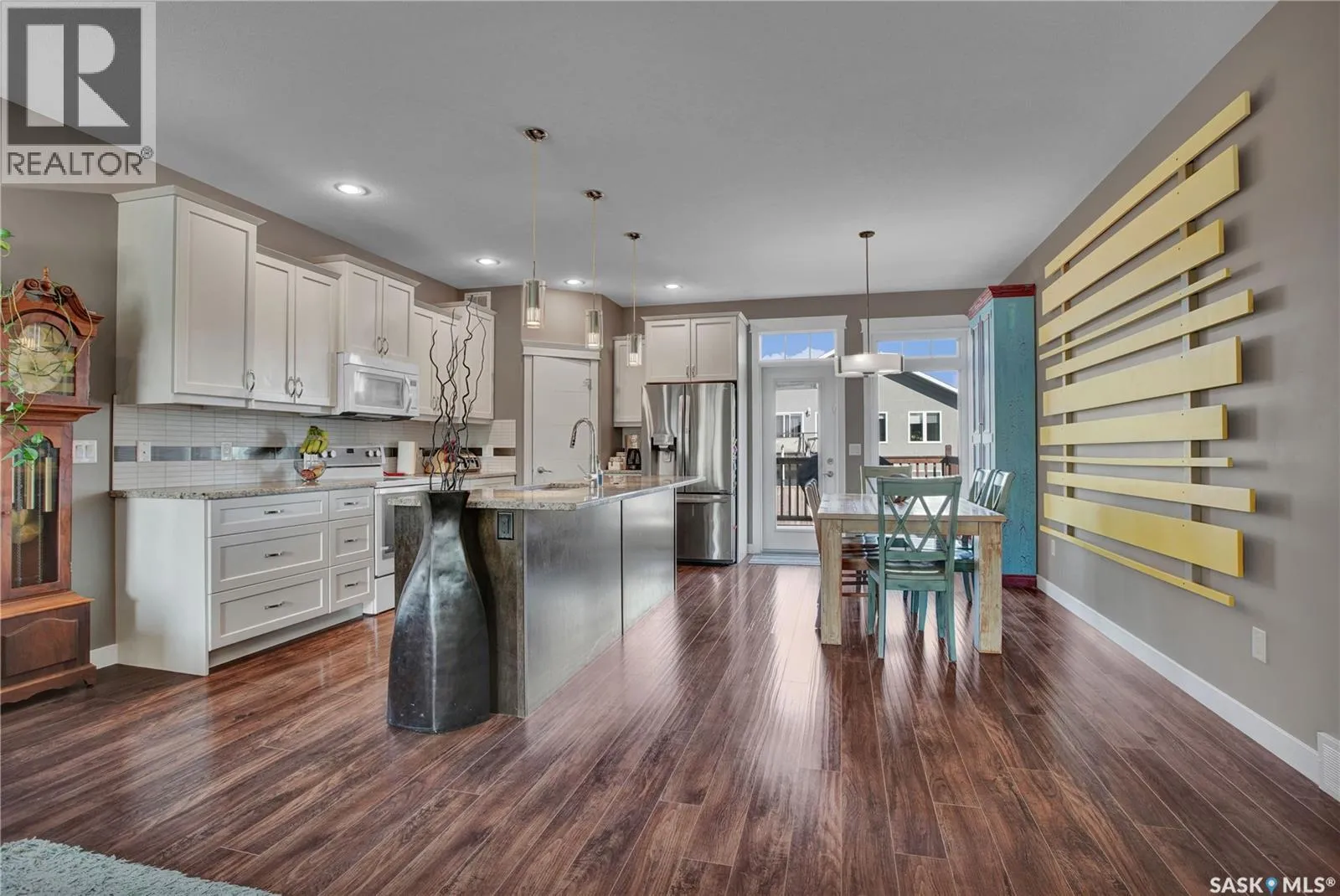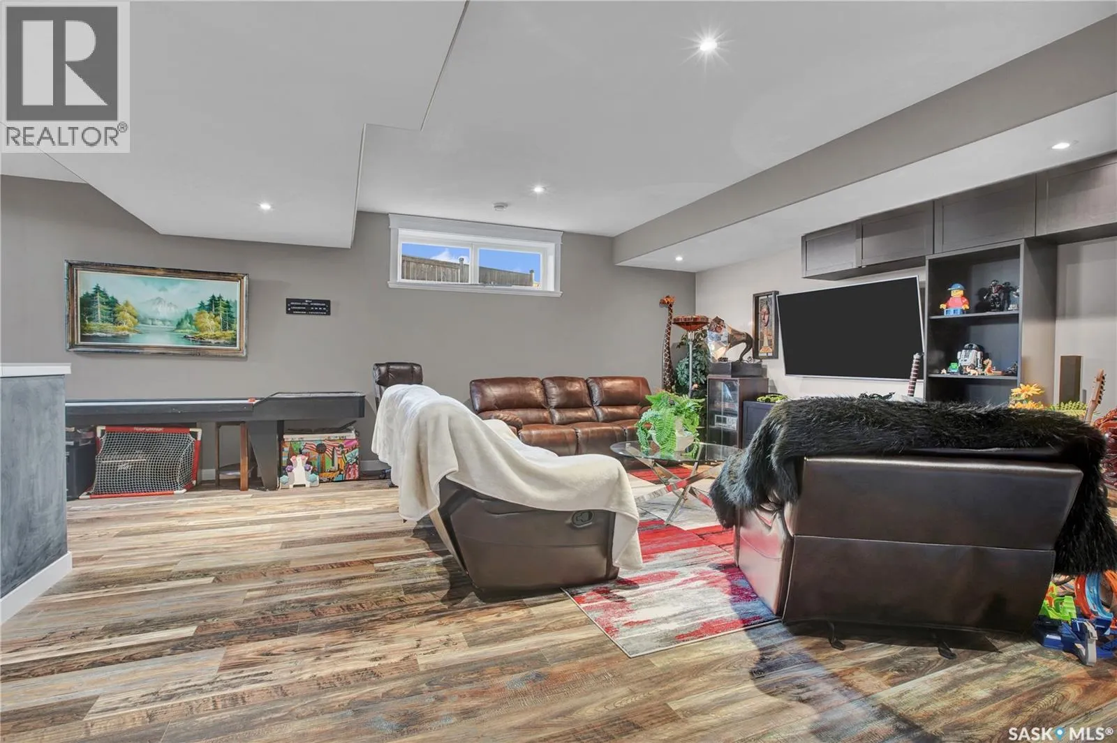 Welcome home to this immaculate 1,316 sq. ft. 4-bedroom, 3-bathroom bungalowâfully finished top to bottom and beautifully maintained throughout. The main floor offers a bright, open layout with a spacious living room featuring rich laminate floors and maple railings with metal spindles. The timeless two-tone kitchen includes granite countertops, tile backsplash, a large eat-up island, walk-in corner pantry, and under-cabinet lighting. The dining area easily accommodates large gatherings and includes a glass patio door to the back deck, plus transom windows that fill the space with natural light. Down the hall, the primary suite awaits with an upgraded drop-soffit ceiling, walk-in closet, and a 3-piece ensuite with custom tiled shower. Two additional bedrooms and a full 4-piece bathroom with tile floors and granite countertops complete the main level. The basement was designed for entertaining. A fantastic wet bar area features built-in cabinetry, bar fridge, and a raised seating peninsula. The massive family room is perfect for hosting game nights, movie nights, or setting up your home theater, and the adjoining games area offers plenty of room for a pool table or poker table. Youâll also find a large bedroom, another full 4-piece bathroom, and a spacious laundry/storage/utility roomâplus extra storage under the stairs. Outside, this property sits on a huge inside-corner, irregular lot with ample room for a trampoline, play structure, firepit, and more. Enjoy relaxing on the back deck with plenty of open views behind you looking out towards the golf course. Additional highlights include central A/C, HRV, an extra-wide concrete driveway, and an oversized 26âx26â attached garage that is fully insulated and drywalled. Upgraded bungalows like this are a rare find in Warmanâthis one shows 10/10 and is ready for its next owners. Contact your favourite Realtor today to book a private viewing! (id:27476)