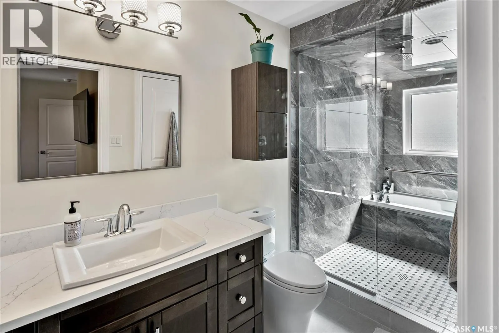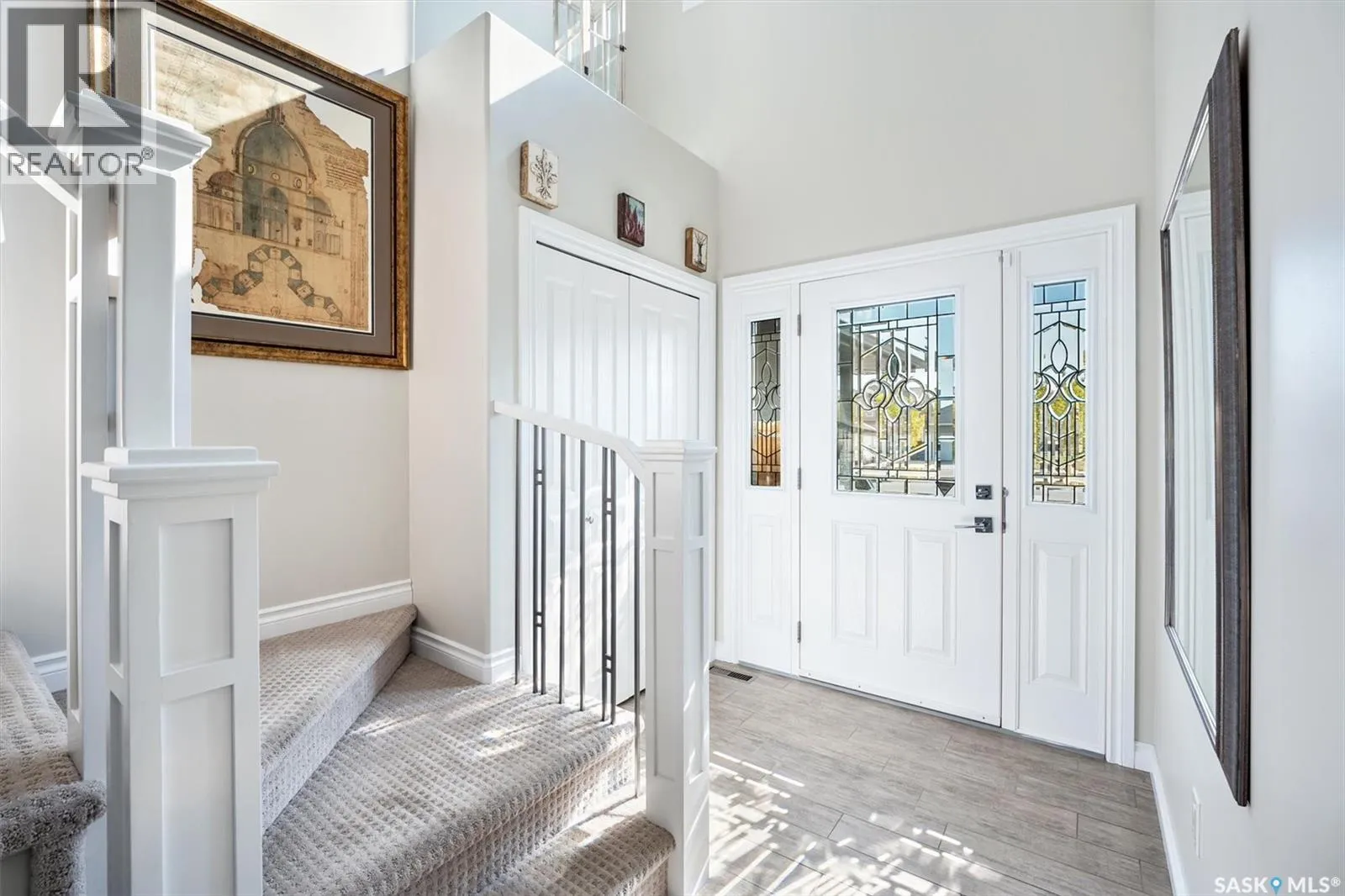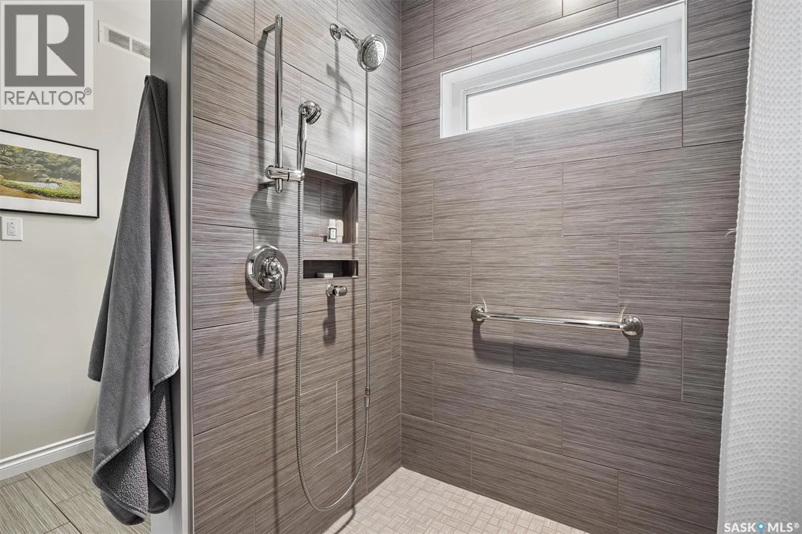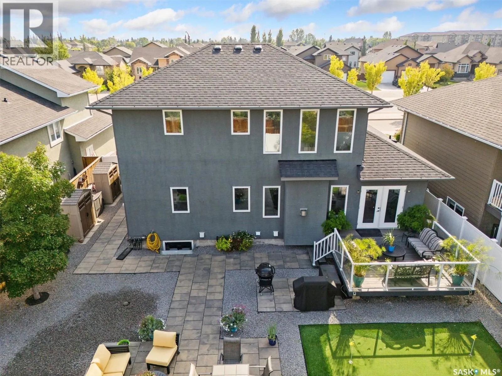 Immaculate custom-built home in Warman with Premium finishings designed with wheelchair accessibility in mind. Main Floor: Extra-wide galley kitchen with granite counters, high-end appliances (gas stove/hood fan, double-door fridge/freezer, built-in microwave, dishwasher). Main-floor primary bedroom with walk-in closet and direct access to 3-pc accessible bath. Wide hallways, lever handles, roll-under sinks. Personal 3-stop elevator with access to garage, main, and basement. Second Floor: Second primary bedroom plus bedroom/office. Shared 4-pc bath (reno 2022) with access from both rooms. Basement: Exceptional entertainment space featuring a large family/media room with fireplace, custom shelving, and 10-speaker Dolby Atmos system. High-end wet bar with granite island, dual-drawer dishwasher, drying-rack sink, custom cabinets, and glass wine cellar (300 bottles). Bedroom with built-in queen Murphy bed next to 3-pc bath. Laundry, storage, and utility rooms. Garage: Fully insulated and heated double garage with EV charger and full golf simulator (projector, retractable screen/enclosure). Elevator access. Yard: Low-maintenance landscaping with composite deck, 4-hole putting green, artificial chipping area, extensive patio with multiple seating/BBQ areas, vinyl fencing, large garden boxes with underground sprinklers, and four storage sheds. Accessibility Highlights: Two roll-in showers with grab bars and multi-head fixtures, full turning radius bathrooms, wide hallways/kitchen, extra-wide fence gates, moveable rubber ramp, main-floor bedroom sized for lift use. Updates: Hot water tank (2019), upstairs bath (2022). A must see for any family! (id:27476)