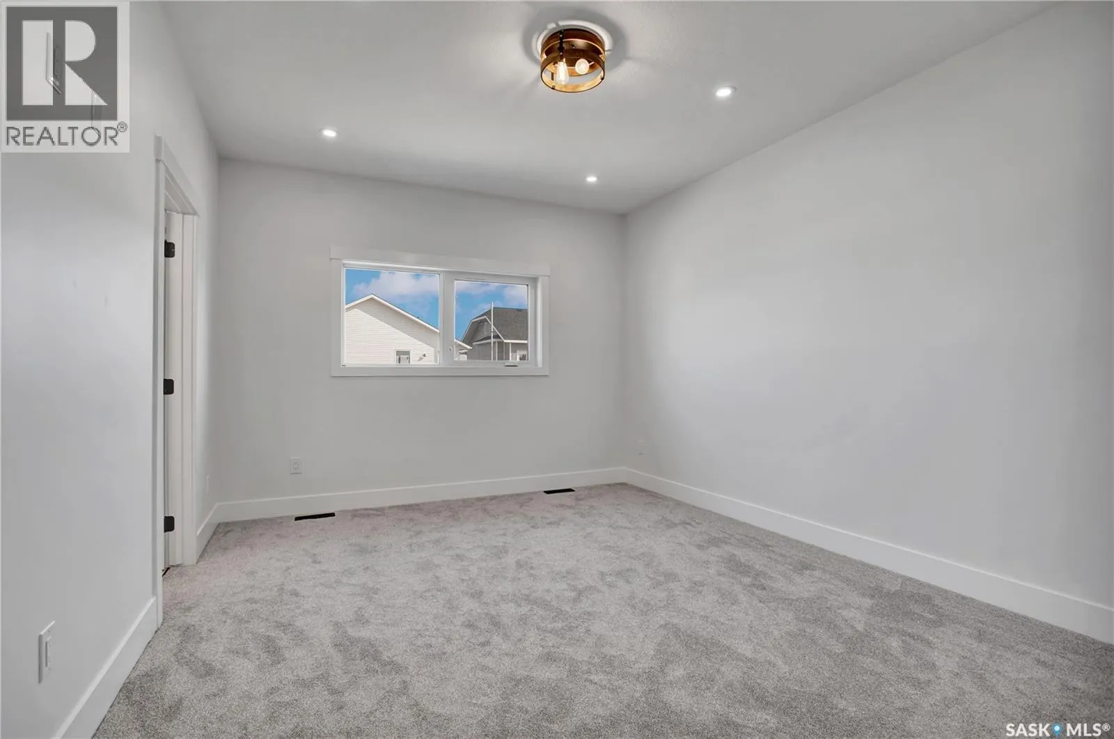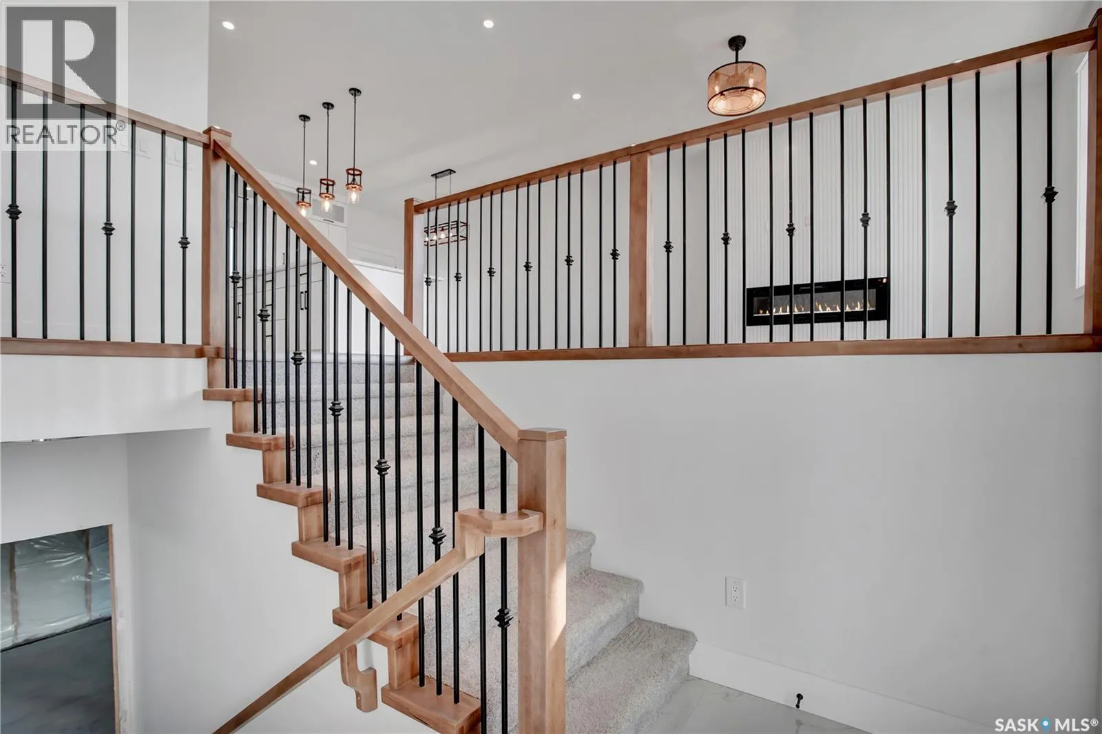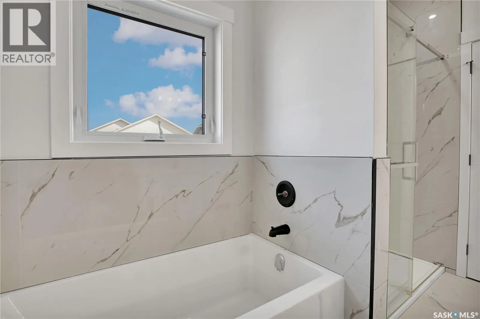 Great opportunity to live in a brand new home in Warman close to the Legends Golf Course, Sports Centre, grocery stores and all other amenities. 1,527 sqft bi-level. Spacious/open concept with 9â ceilings up and 9' down giving it a light/bright/ modern feel. Main level is perfect for entertaining guests. Kitchen has island, corner pantry, tile backsplash, and ample cupboard storage. You'll love the luxurious en-suite bathroom off the primary bedroom with double sink, soaker tub & beautiful custom tile shower. Lots of high-end finishings throughout with upgraded vinyl flooring, unique fixtures, quartz and tile work. Other notable features include a gorgeous electric fireplace in the living room & a covered deck (no stairs included) + vinyl fence. Also has a triple attached garage (insulated & natural gas heat) and a triple concrete driveway. Southeast facing front with lovely street appeal on a pie shaped lot with extra space in the backyard. Interior photo's are from a different house, same plan. Established local builder, Blanket New Home Warranty, call today! (id:27476)