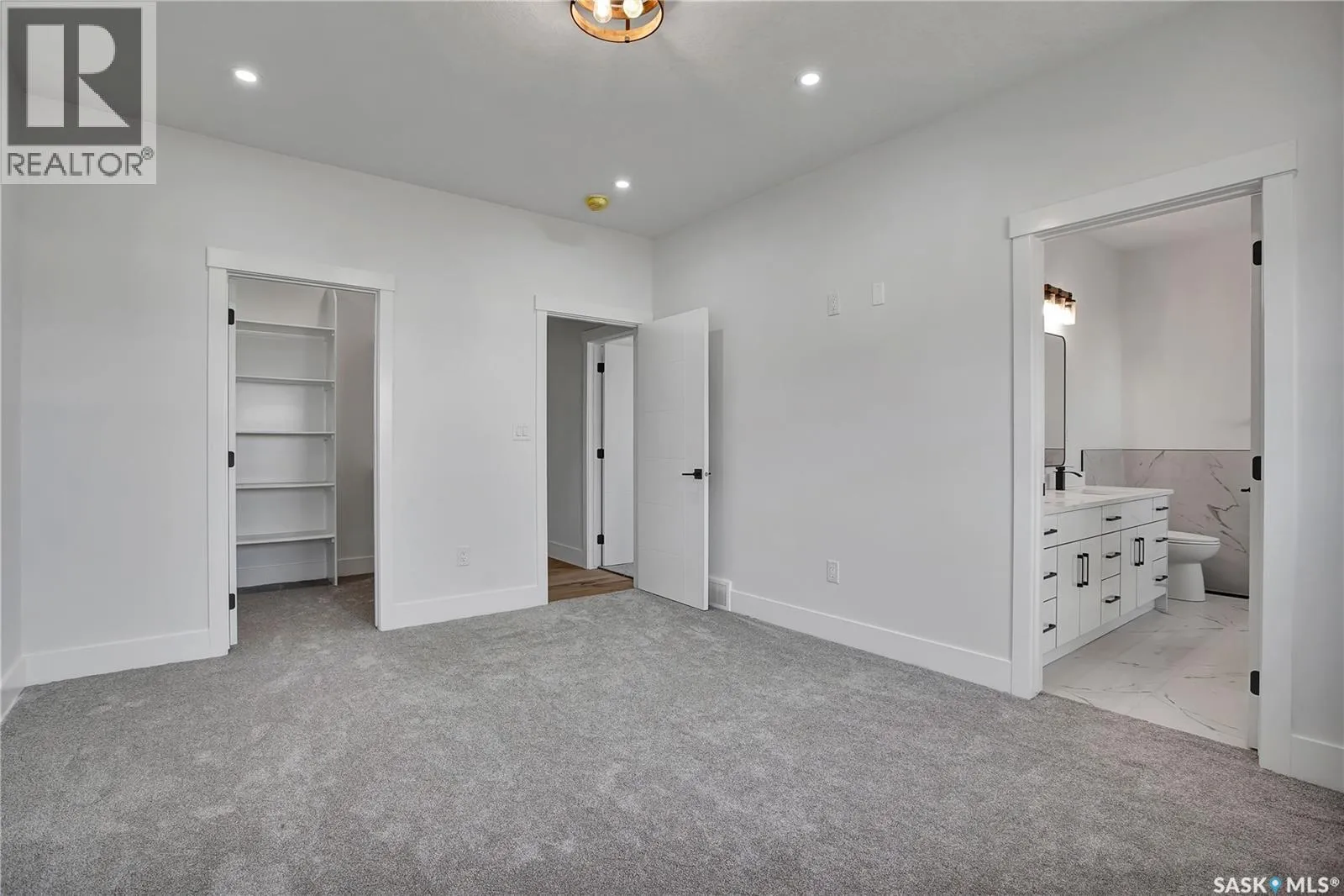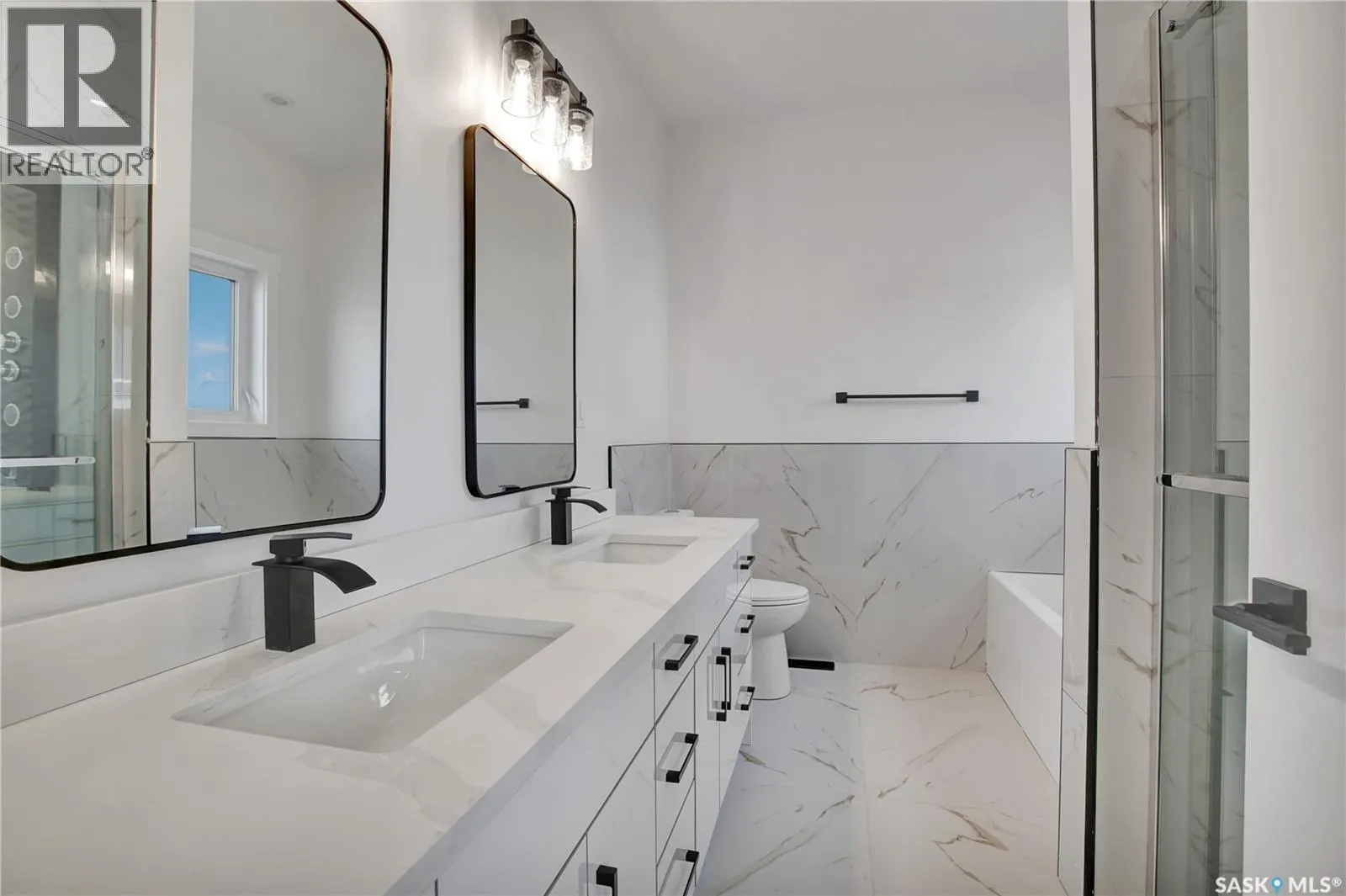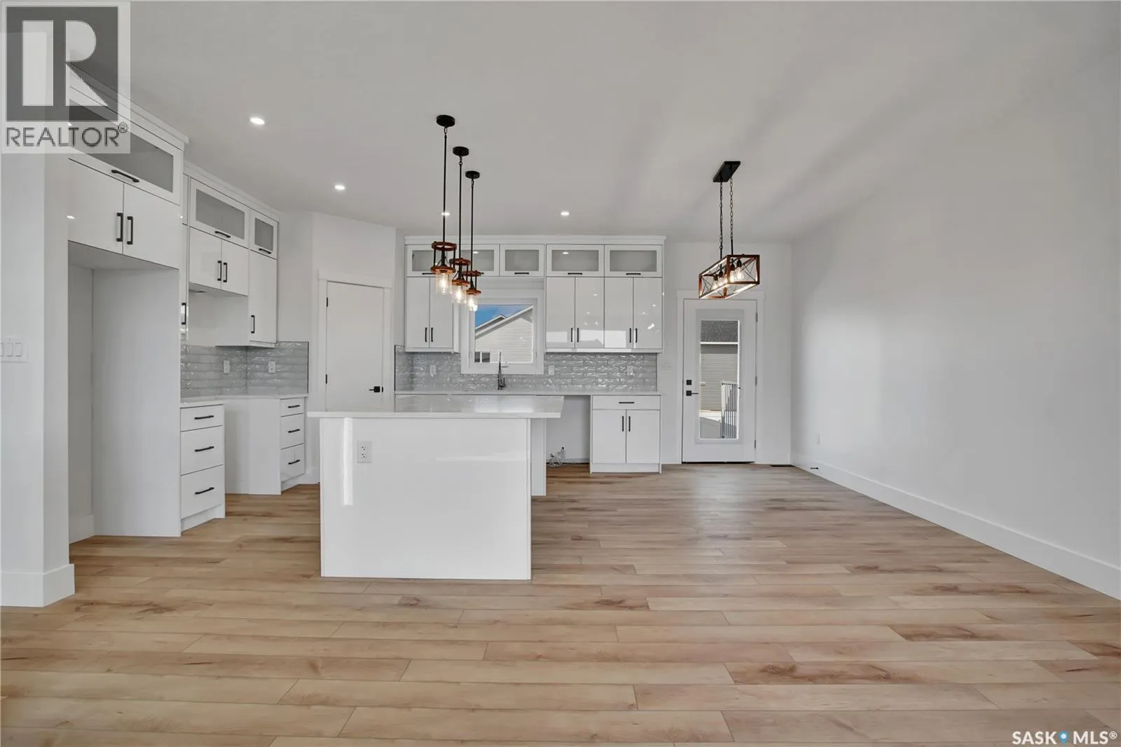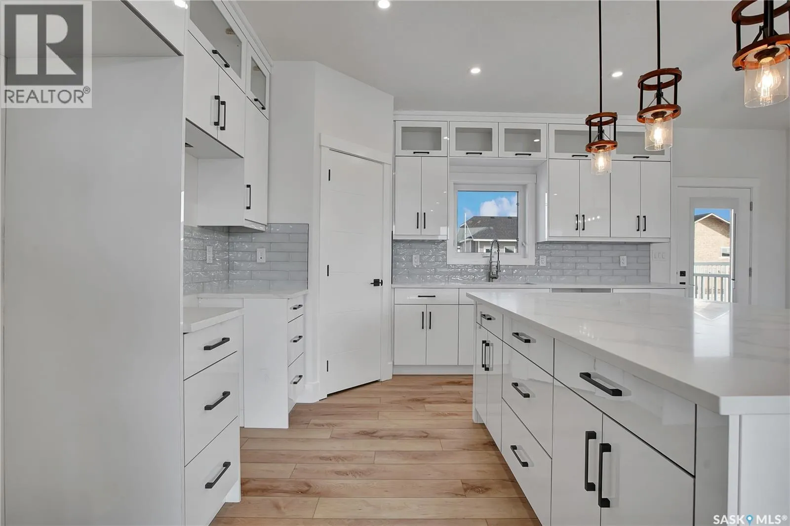 Great opportunity to live in a brand new home in Warman close to the Legends Golf Course, Sports Centre, grocery stores and all other amenities. 1,527 sqft bi-level. Spacious/open concept with 9â ceilings up and 9' down giving it a light/bright/ modern feel. Main level is perfect for entertaining guests. Kitchen has island, corner pantry, tile backsplash, and ample cupboard storage. You'll love the luxurious en-suite bathroom off the primary bedroom with double sink, soaker tub & beautiful custom tile shower. Lots of high-end finishings throughout with upgraded vinyl flooring, unique fixtures, quartz and tile work. Other notable features include a gorgeous electric fireplace in the living room & a covered deck (no stairs included) + vinyl fence. Also has a triple attached garage (insulated & natural gas heat) and a triple concrete driveway. Southeast facing front with lovely street appeal on a pie shaped lot with extra space in the backyard. Interior photo's are from a different house, same plan. Established local builder, Blanket New Home Warranty, call today! (id:27476)