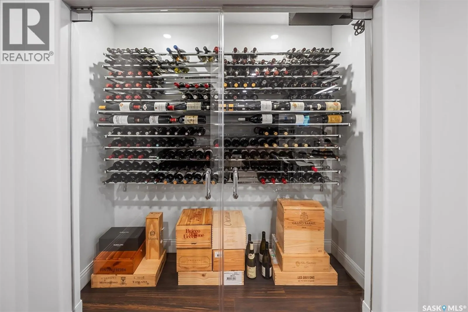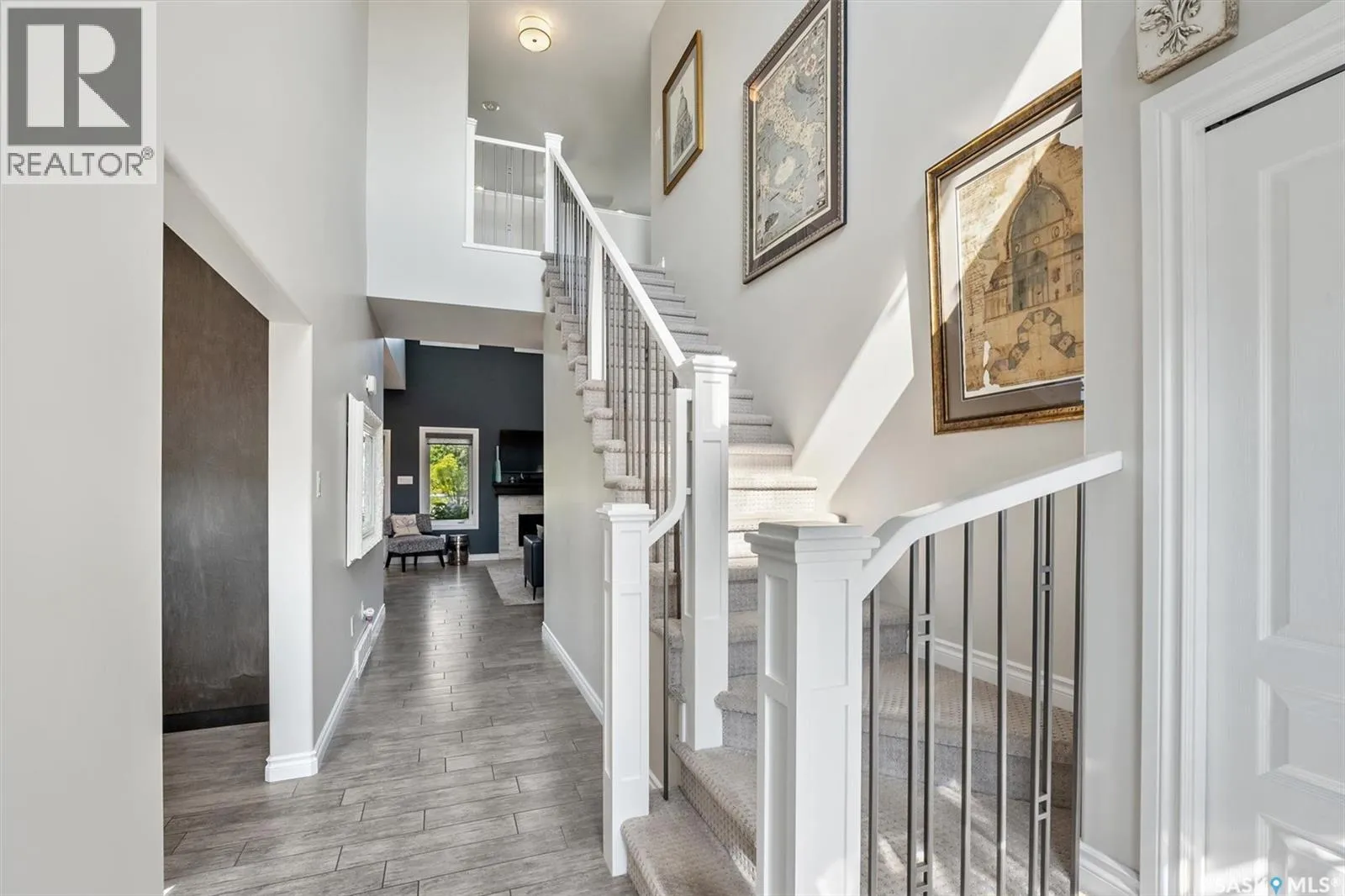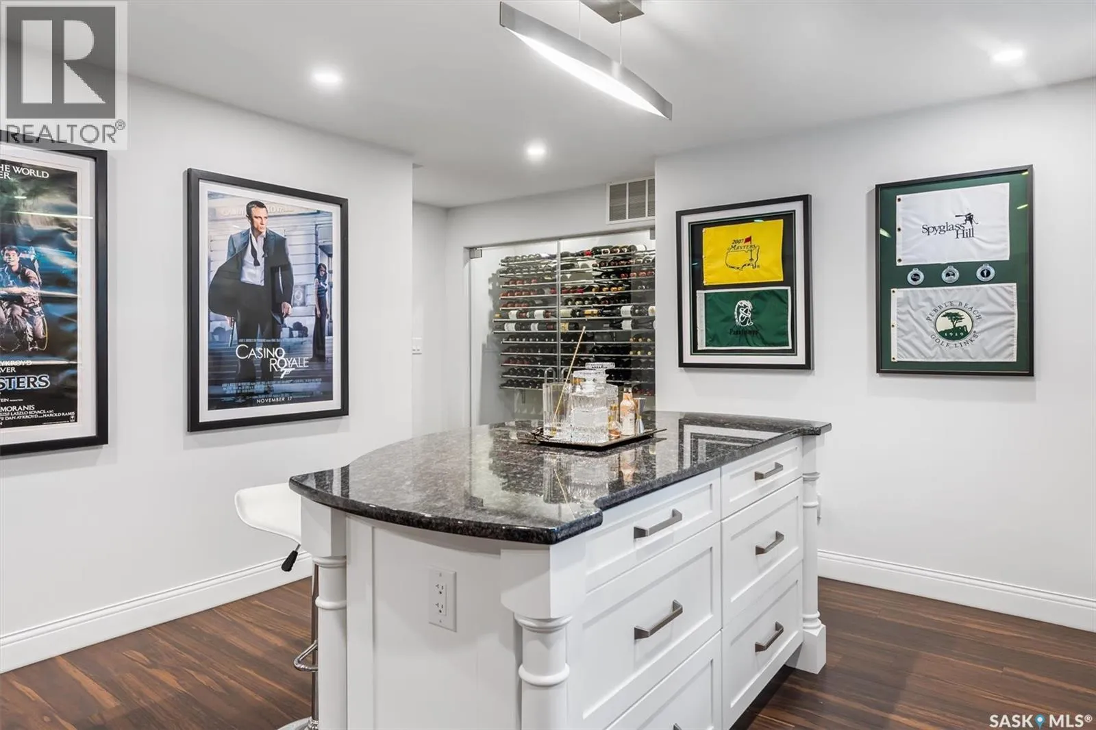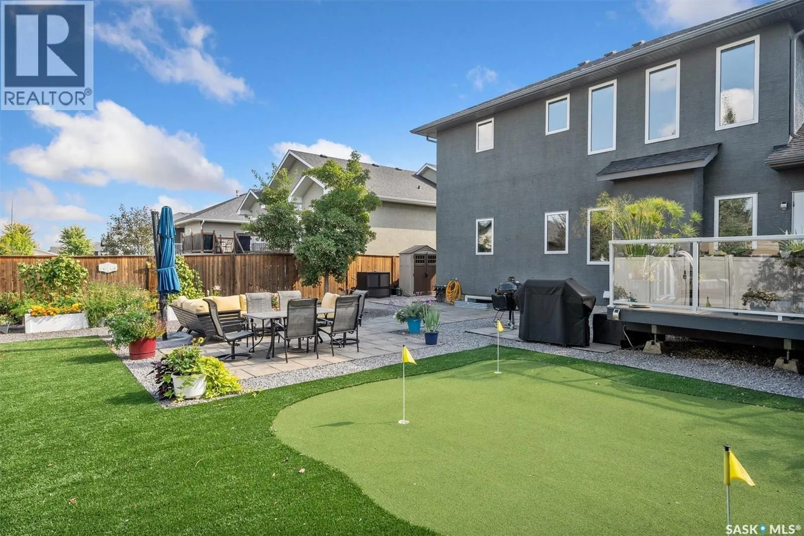 Immaculate custom-built home in Warman with Premium finishings designed with wheelchair accessibility in mind. Main Floor: Extra-wide galley kitchen with granite counters, high-end appliances (gas stove/hood fan, double-door fridge/freezer, built-in microwave, dishwasher). Main-floor primary bedroom with walk-in closet and direct access to 3-pc accessible bath. Wide hallways, lever handles, roll-under sinks. Personal 3-stop elevator with access to garage, main, and basement. Second Floor: Second primary bedroom plus bedroom/office. Shared 4-pc bath (reno 2022) with access from both rooms. Basement: Exceptional entertainment space featuring a large family/media room with fireplace, custom shelving, and 10-speaker Dolby Atmos system. High-end wet bar with granite island, dual-drawer dishwasher, drying-rack sink, custom cabinets, and glass wine cellar (300 bottles). Bedroom with built-in queen Murphy bed next to 3-pc bath. Laundry, storage, and utility rooms. Garage: Fully insulated and heated double garage with EV charger and full golf simulator (projector, retractable screen/enclosure). Elevator access. Yard: Low-maintenance landscaping with composite deck, 4-hole putting green, artificial chipping area, extensive patio with multiple seating/BBQ areas, vinyl fencing, large garden boxes with underground sprinklers, and four storage sheds. Accessibility Highlights: Two roll-in showers with grab bars and multi-head fixtures, full turning radius bathrooms, wide hallways/kitchen, extra-wide fence gates, moveable rubber ramp, main-floor bedroom sized for lift use. Updates: Hot water tank (2019), upstairs bath (2022). A must see for any family! (id:27476)