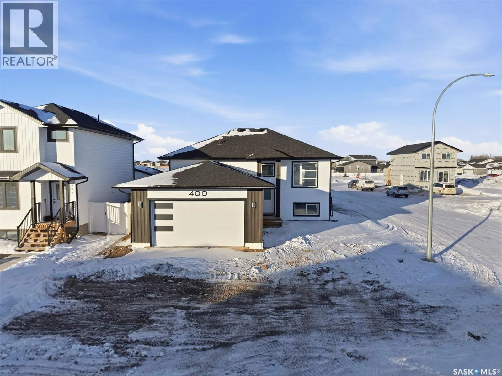 Welcome to 400 Eldorado St. located in the growing city of Warman & situated on a large corner lot with close proximity to parks, walking paths, the Warman BMX track, the skate park & ball diamonds. This beautifully finished 1280 sq.ft bi-level style home with a double attached garage features separate entry into an unfinished basement that is set up for a future 2- bedroom legal suite! The main floor has a large foyer with tiled floors, a seating area & closet for coats/boots. The home has an open concept kitchen to living room & dining area. The kitchen features tile backsplash, quartz countertops, Stainless steel appliances, a hood fan that vents directly outside & a large island. The dining room walks out on to a large deck overlooking the future backyard. The main floor also has a 4-piece bathroom, 3 good sized bedrooms with the primary bedroom having a 4-piece ensuite bathroom & a large walk-in closet. The basement can be accessed from the main floor or separate side entrance. It has the laundry area, mechanical room & it is unfinished ready for a future suite. This home has Progressive new home warranty included & is built by Royal Choice Homes Ltd. with great attention to detail & quality finishes. It comes complete with all appliances, washer, dryer, 2 electrical metres & an air exchanger. There are options to have the basement finished or driveway included at additional cost â all work weather permitting. GST/PST included in the purchase price with rebate to the builder. (The Secondary Suite Incentive program will be extended to 2027- Information can be viewed through Saskatchewan Suite Incentive to be Extended to 2027). Call to view. (id:27476)