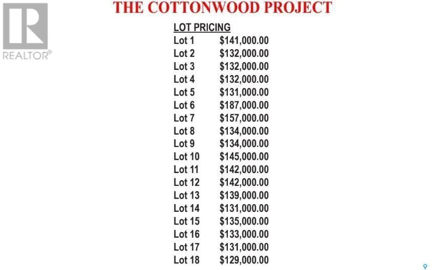 Welcome to Cottonwood Project - Weyburn's exciting, new residential neighborhood development! Nestled in a beautifully treed area in a developed residential location, the Cottonwood Project offers an opportunity previously unavailable in Weyburn - the chance to build your dream home among large, mature trees and be located within the heart of the city rather than restricted to a fringe area as with other residential lot developments. The Cottonwood Project is bordered by 13th St on one side, Hartney Ave on another, and Ashford St on the back. It is across from St. Michael School - Weyburn's only Catholic School (pre-K to grade 9). Additionally, it is within easy walking distance to public schools, Jubilee Park (the central location for baseball, soccer, tennis), the City Leisure Centre and outdoor pool, and more. With a variety of sizes, there are lots for everyone. From large pie-shaped lots, to elongated lots and standard rectangular options - you won't be disappointed. Kenney Crescent is a central L-shaped road which services the neighborhood, creating that community feel. If you've been looking for that perfect place to build your family home but haven't been satisfied with the current options, check out the Cottonwood Project. (id:27476)