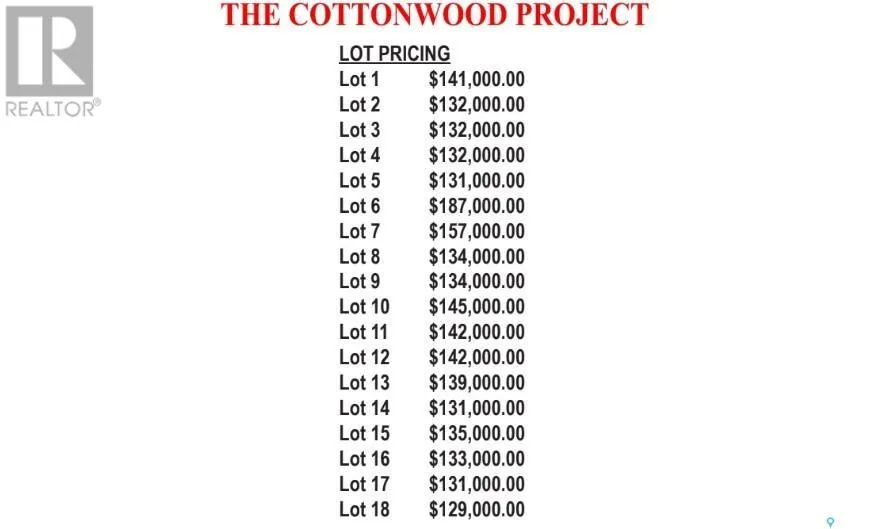 Welcome to Cottonwood Project - Weyburn's exciting, newer residential neighborhood development! Nestled in a beautifully treed area in a developed residential location, the Cottonwood Project offers an opportunity previously unavailable in Weyburn - the chance to build your dream home among large, mature trees and be located within the heart of the city rather than restricted to a fringe area as with other residential lot developments. The Cottonwood Project is bordered by 13th St on one side, Hartney Ave on another, and Ashford St on the back. It is across from St. Michael School (pre-K to grade 9 - Catholic school). Additionally, it is within easy walking distance to Legacy Elementary public school, Jubilee Park (the central location for baseball, soccer, tennis), the City Leisure Centre and outdoor pool. With a variety of sizes, there are lots for everyone. From large pie-shaped lots, to elongated lots and standard rectangular options - you won't be disappointed. Kenney Crescent is a central L-shaped road which services the neighborhood, creating that community feel. If you've been looking for that perfect place to build your family home but haven't been satisfied with the current options, check out the Cottonwood Project. Call today for more information! (id:27476)