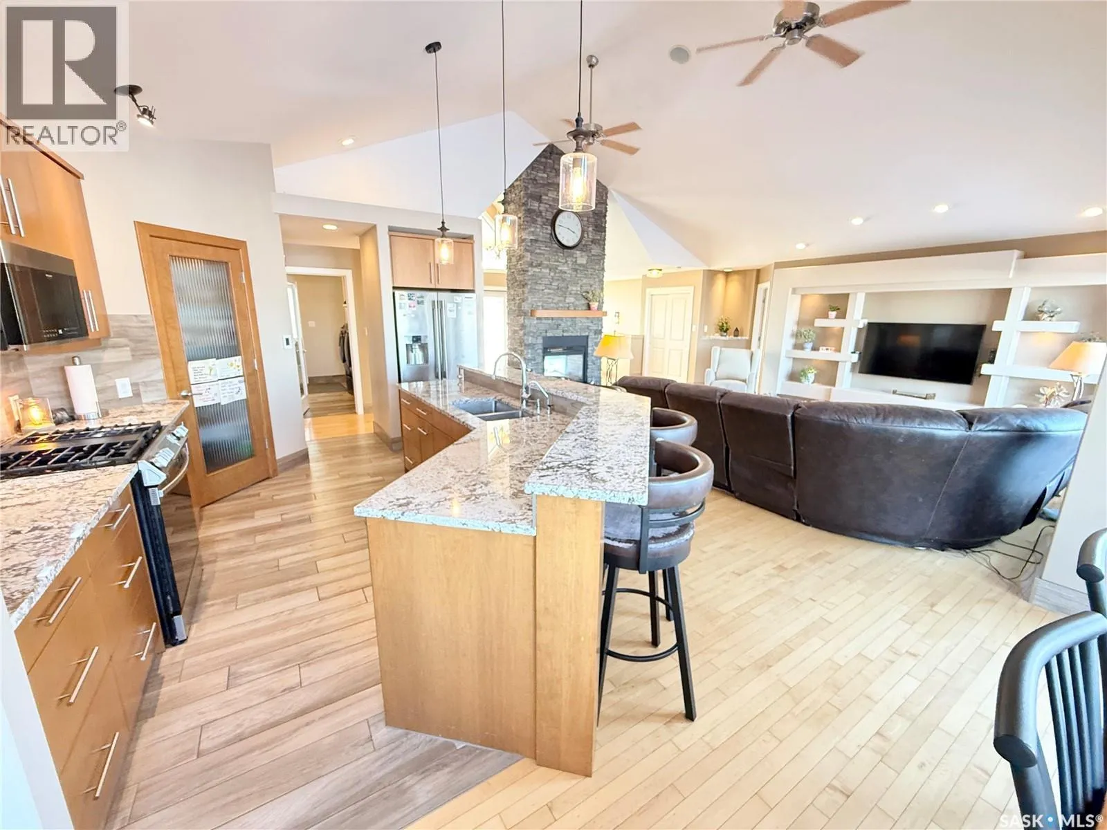 Welcome to 785 Washington Drive â a stunning custom-built bungalow on the edge of Weyburn with wide-open prairie views. This A-frame style home offers tonnes of living space with a bright, open main floor centered around a show-stopping floor-to-ceiling stone fireplace. The great room flows beautifully into the kitchen and dining area, complete with custom cabinetry and massive windows that bring the outdoors in. The primary suite is its own retreat with deck access, walk-through closets, and a spa-like ensuite. Two additional bedrooms, a full bath, and a large bonus loft space round out the main level. Downstairs, the huge in-floor heated basement offers endless options for entertaining, workouts, media space, plus two more bedrooms and a flex room. Outside, enjoy the two-tier deck, custom pergola with swing, underground sprinklers, and gas hookups â perfect for relaxing or hosting. This home has seen extensive updates, including granite countertops, updated flooring, custom shower, new shingles, fresh paint throughout, new lighting, high-efficiency furnace, on-demand water heater, and more. Big home, beautiful views, and tons of upgrades â this one truly has it all. Reach out to your favourite Agent to book your private showing. (id:27476)