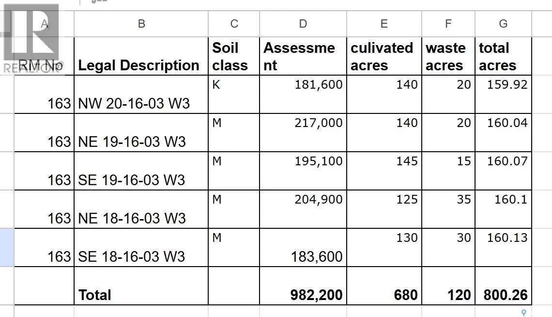 Located approximately 60km west of Moose Jaw SK. 5 Quarters in 1 block ! Located SW of Parkbeg SK, about 60km west of Moose Jaw SK. There are 680 cultivated acres as per SAMA. Total 2025 Assessment is $ 982,200. Average assessment per 160 acre is: $196,440. Land is currently leased till the Dec 31 of 2027. Yearly rent is: $ 37,400 plus GST. (id:27476)
