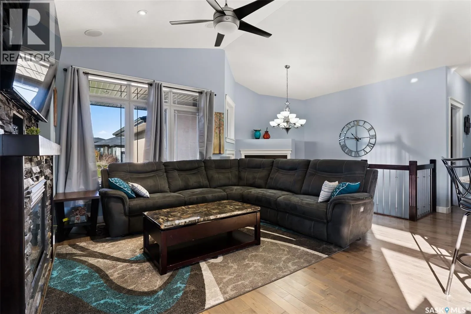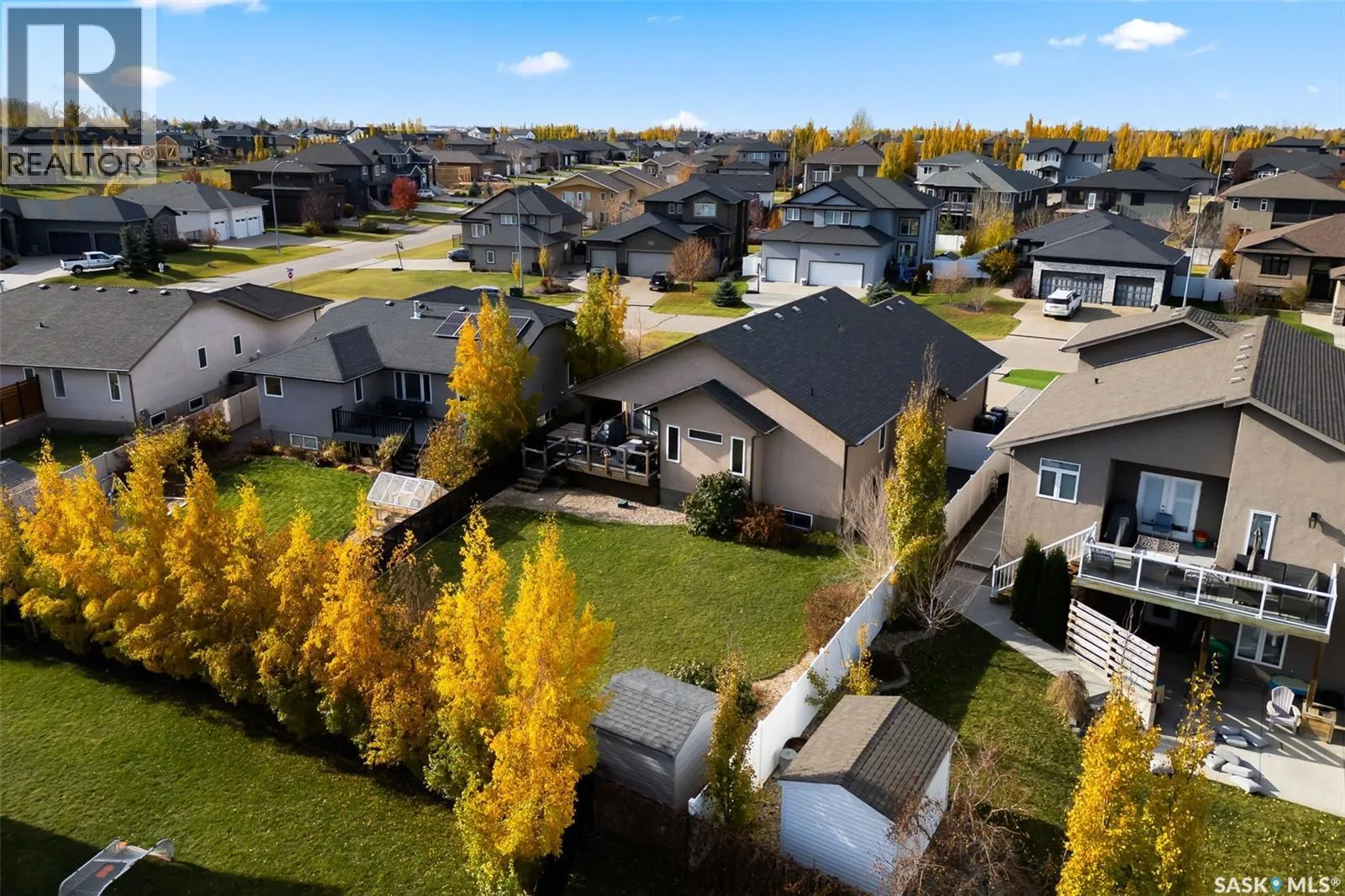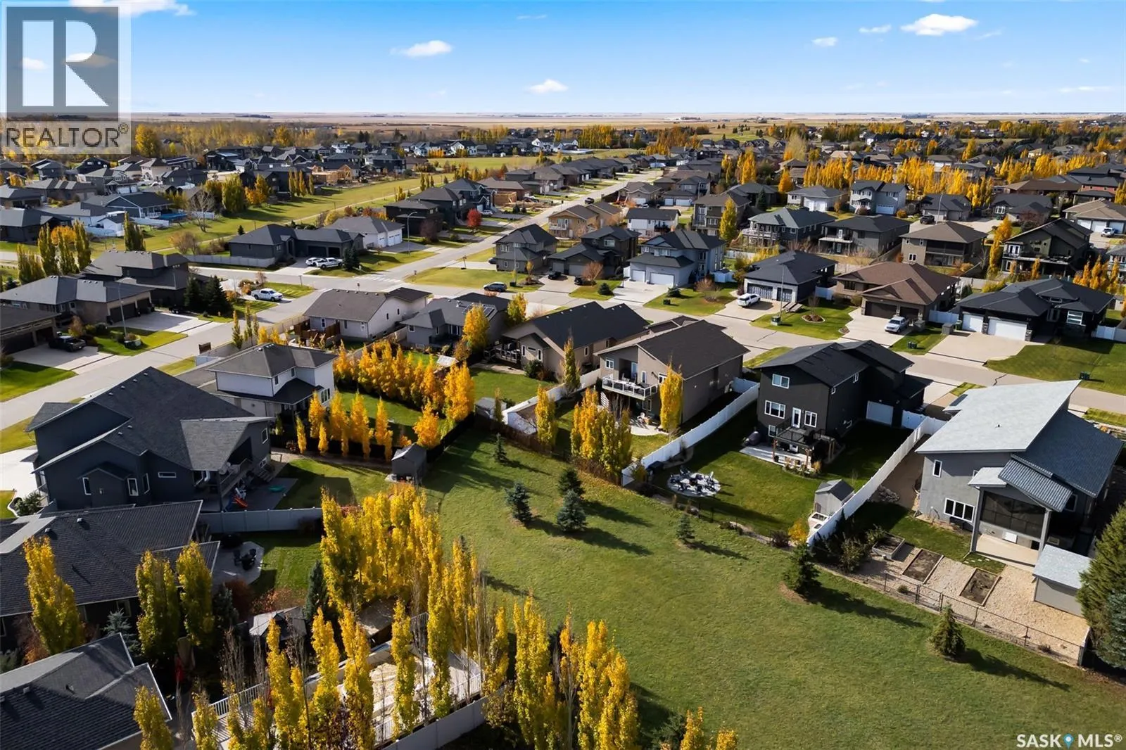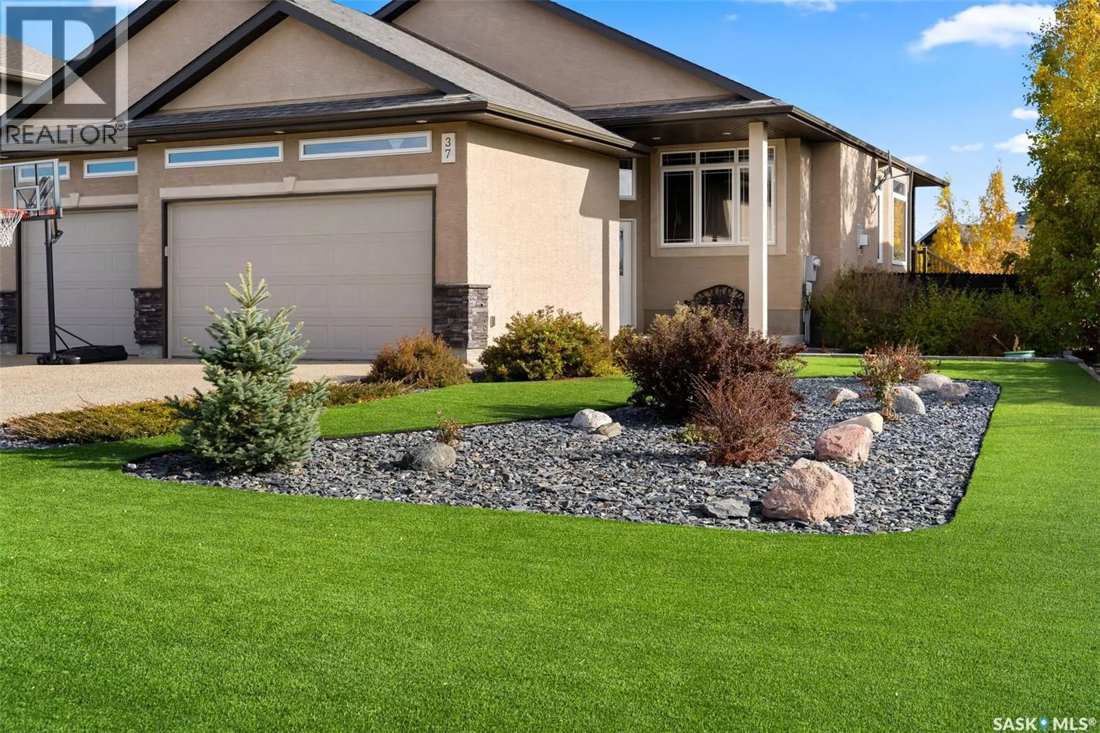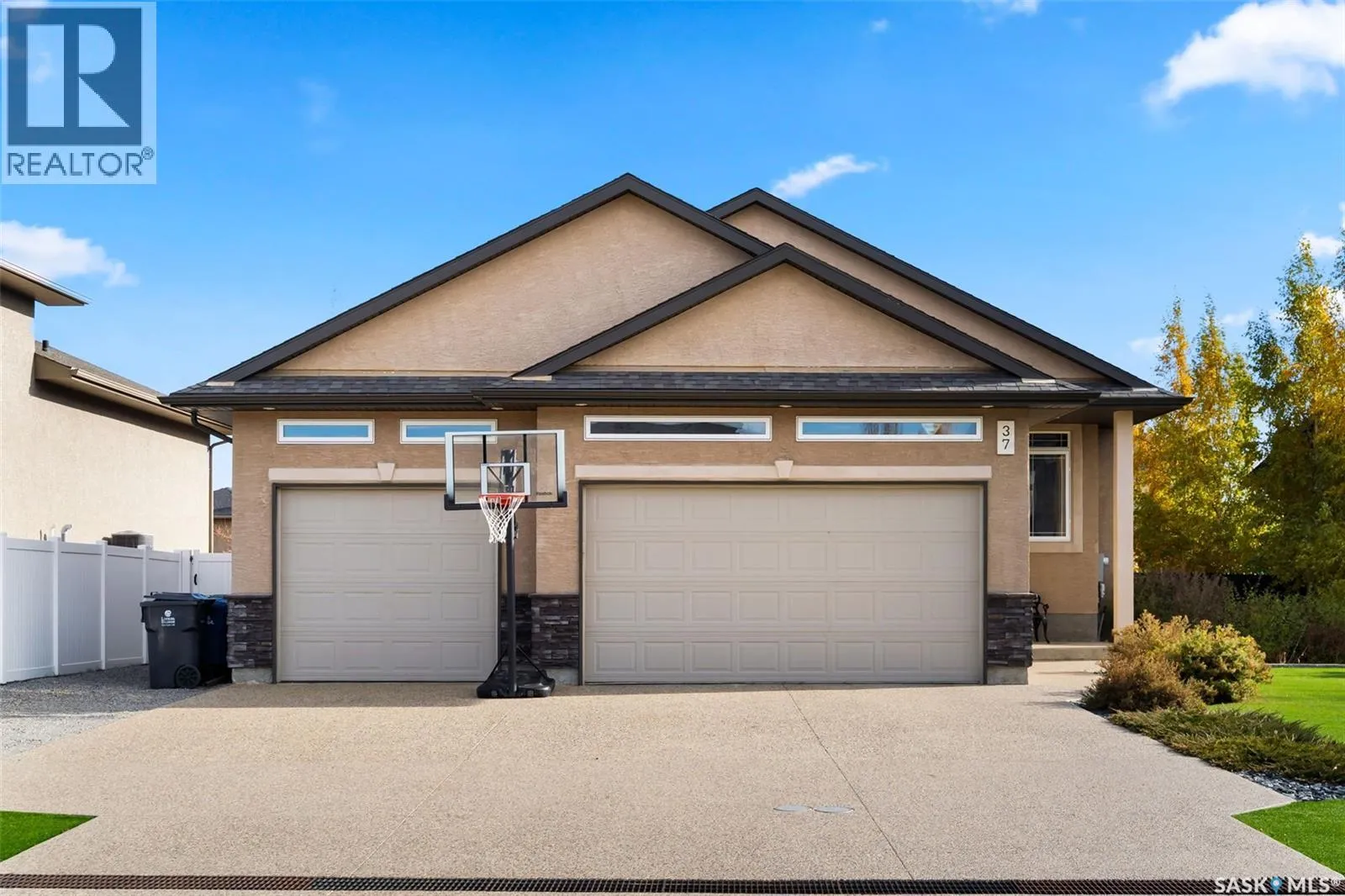 Welcome to 37 Churchill Crescent, White City â A move-in-ready family home just minutes from Regina and an easy walk to the brand-new school. From the moment you arrive, the xeriscaped front yard delivers jaw-dropping curb appeal with almost zero upkeep. Step inside to soaring vaulted ceilings, designer pot lights, and sunlight pouring across the open main floor. A stacked-stone gas fireplace anchors the living room, flowing seamlessly into the dining area and a chef-worthy kitchen featuring rich espresso maple cabinetry, granite counters, a huge eat-up island, walk-in pantry, and direct access to the covered veranda for effortless indoor-outdoor living. The private primary suite is a true retreat with its own deck door, spa-like 4-piece ensuite, and spacious walk-in closet. Two more bright bedrooms with clever recessed closets, a stylish 4-piece main bath, and convenient main-floor laundry round out the main level. Downstairs, the fully finished basement is built for fun and comfort: massive family room, dedicated games area, sleek wet bar, an oversized fourth bedroom, full 4-piece bath, and tons of storage. Builder spray-foam insulation keeps everything cozy and energy bills low. The heated 32'Ã26' triple garage with 14' ceilings and room for a car lift (negotiable) is a rare gem. The backyard is pure joy: hot tub, fenced dog run, raised garden beds, storage shed, underground sprinklers, and a huge covered veranda that extends the season. Meticulously maintained, loaded with upgrades, and ready for you to move in â this is the turn-key White City dream home youâve been waiting for. Come fall in love today. (id:27476)