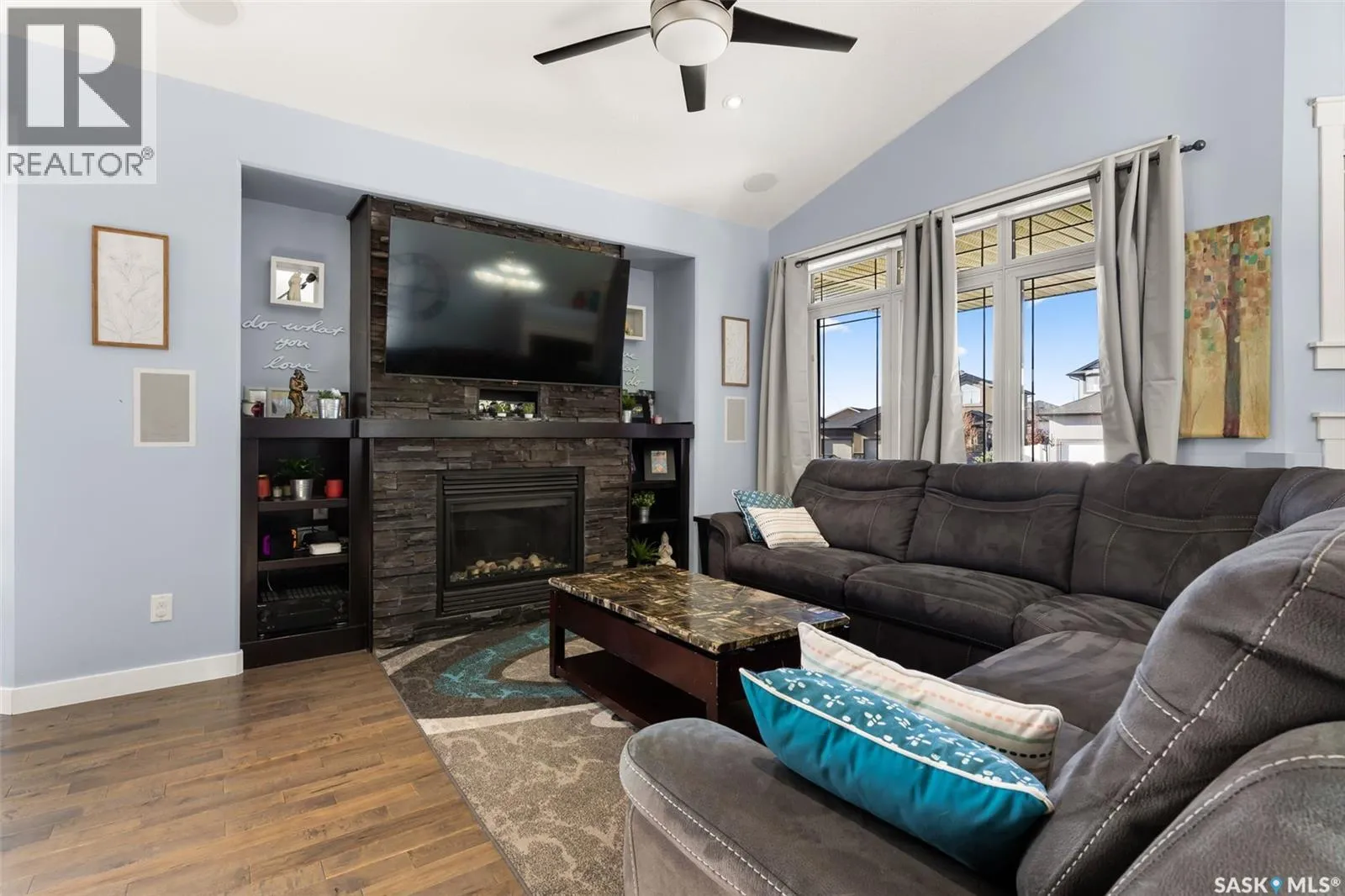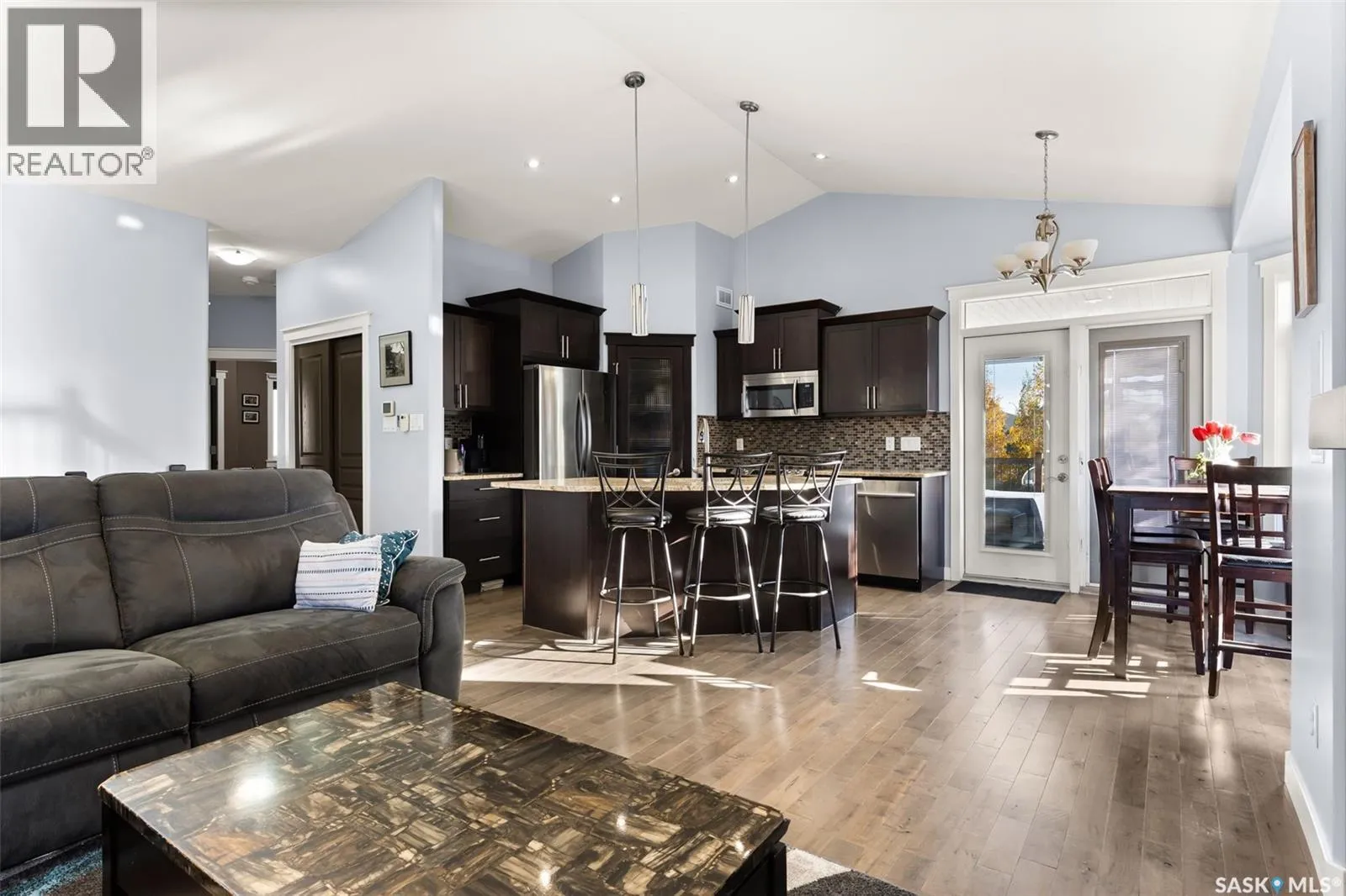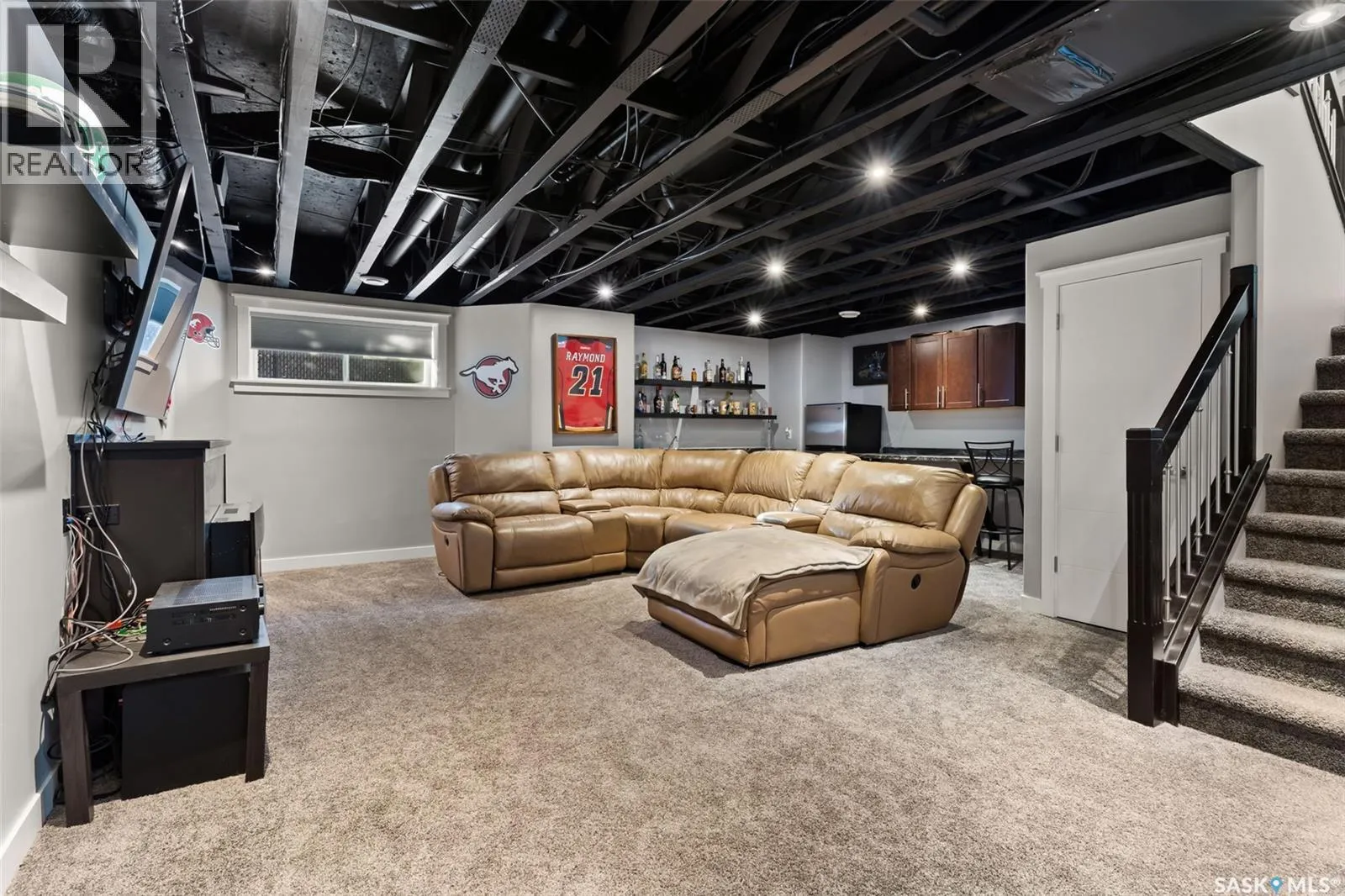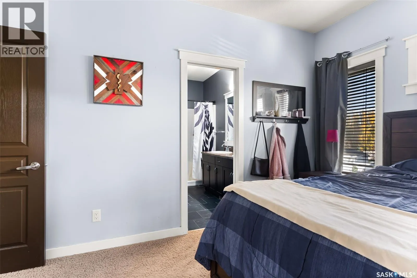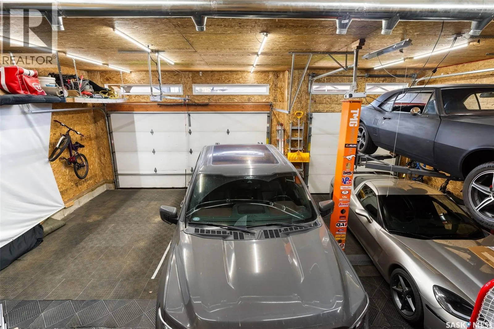 Welcome to 37 Churchill Crescent, White City â A move-in-ready family home just minutes from Regina and an easy walk to the brand-new school. From the moment you arrive, the xeriscaped front yard delivers jaw-dropping curb appeal with almost zero upkeep. Step inside to soaring vaulted ceilings, designer pot lights, and sunlight pouring across the open main floor. A stacked-stone gas fireplace anchors the living room, flowing seamlessly into the dining area and a chef-worthy kitchen featuring rich espresso maple cabinetry, granite counters, a huge eat-up island, walk-in pantry, and direct access to the covered veranda for effortless indoor-outdoor living. The private primary suite is a true retreat with its own deck door, spa-like 4-piece ensuite, and spacious walk-in closet. Two more bright bedrooms with clever recessed closets, a stylish 4-piece main bath, and convenient main-floor laundry round out the main level. Downstairs, the fully finished basement is built for fun and comfort: massive family room, dedicated games area, sleek wet bar, an oversized fourth bedroom, full 4-piece bath, and tons of storage. Builder spray-foam insulation keeps everything cozy and energy bills low. The heated 32'Ã26' triple garage with 14' ceilings and room for a car lift (negotiable) is a rare gem. The backyard is pure joy: hot tub, fenced dog run, raised garden beds, storage shed, underground sprinklers, and a huge covered veranda that extends the season. Meticulously maintained, loaded with upgrades, and ready for you to move in â this is the turn-key White City dream home youâve been waiting for. Come fall in love today. (id:27476)