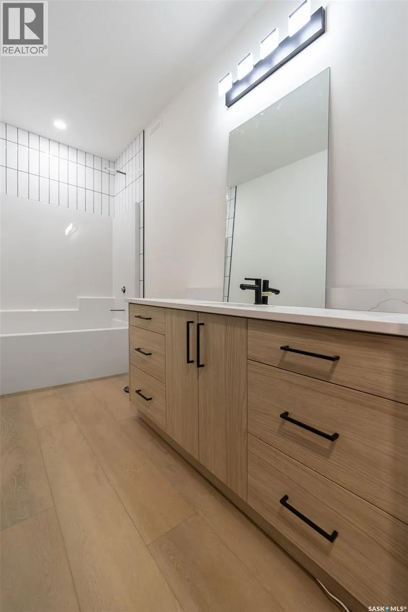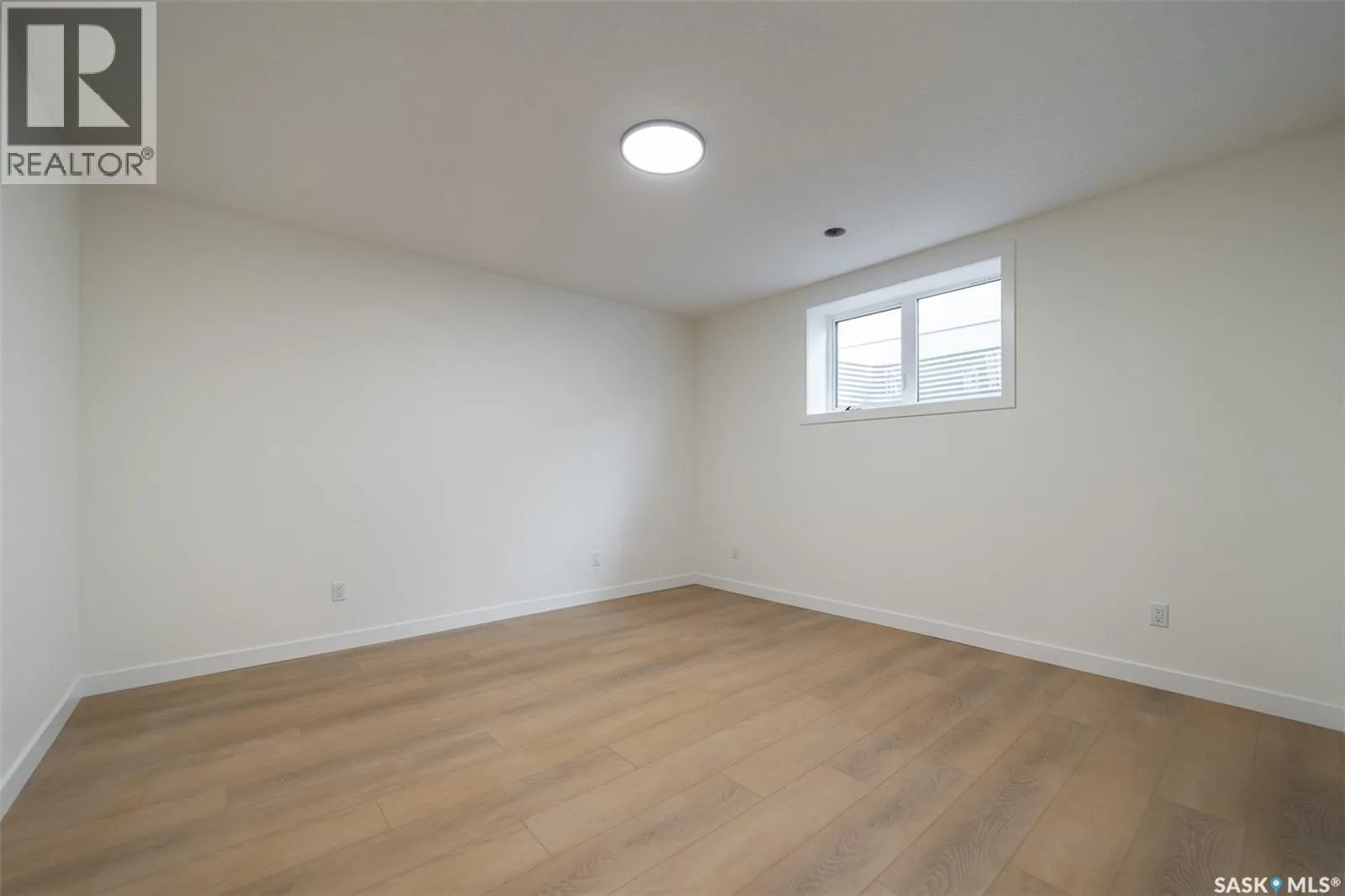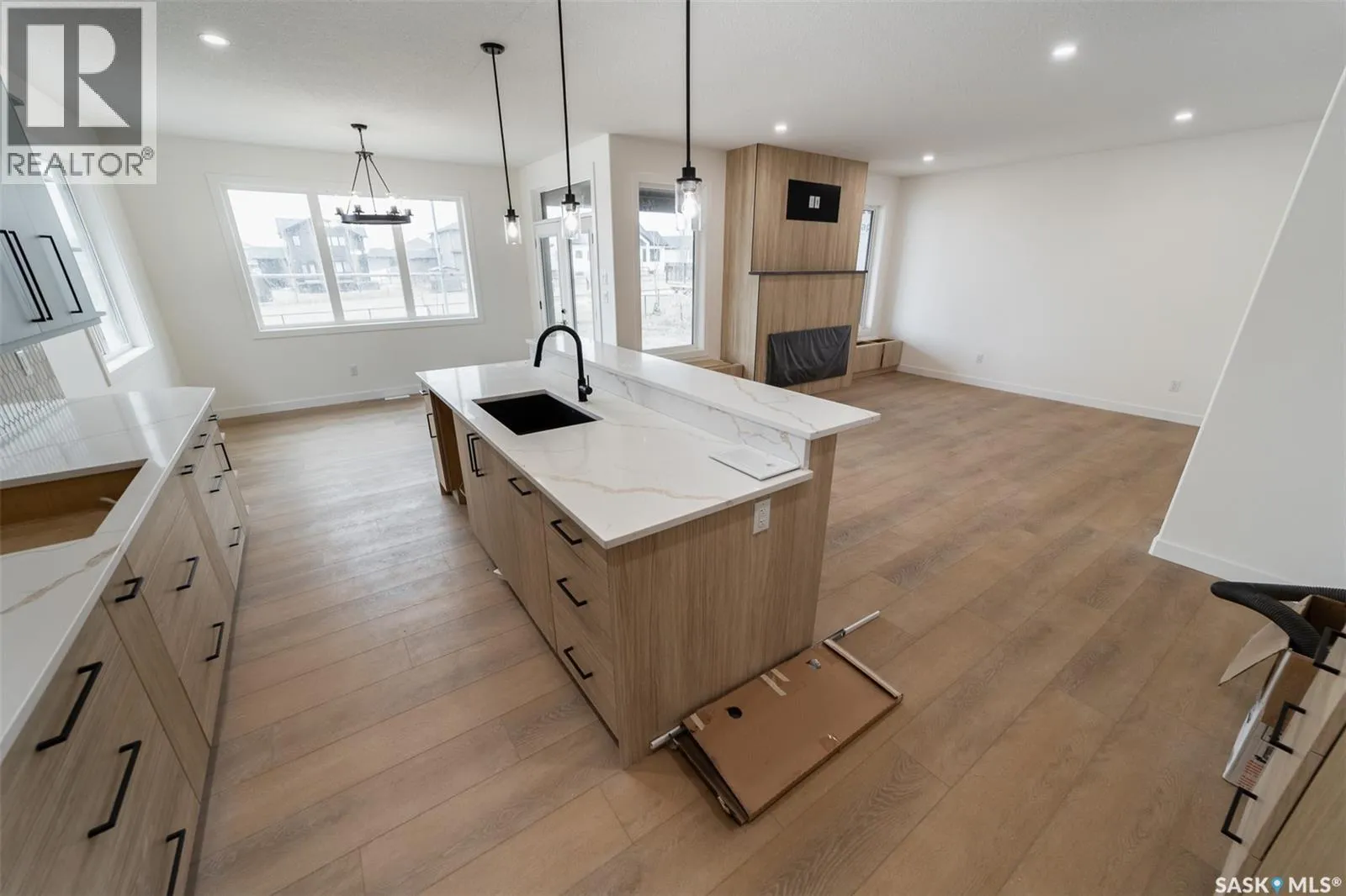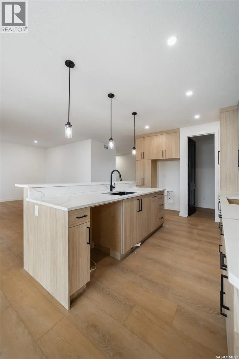 Welcome to this beautiful 1704 sqft custom built home backing green space. Walking and biking paths are at the back of the house and situated only a block away from the new White City School. Home features lots of oversized windows for natural light and has 8-foot-tall interior doors. Features include modern, custom installed hand railing staircase opened to the lower level, a luxurious kitchen with two tone cabinetry and a convenient 9 feet 2 level eat-in island, quartz countertops complemented with ceramic tiled backsplash and an oversized walk-in pantry with lots of storage. The main floor boasts 2 large bedrooms, a main bathroom, large office (that can be used as a bedroom), ensuite bathroom with a makeup station, walk-in closets, large cozy living room with LVP flooring, modern linear gas fireplace, stainless steel appliances in the kitchen. It also has an amazing covered 15'-0" x 12-0" balcony with a French door, waterproof membrane, and a gas BBQ connection. Lower level is fully developed with LVP flooring throughout, spacious recreational room, 2 large bedrooms with a walk-in closet in each bedroom, wet bar, 4pc bath, large laundry room with cabinets and appliances, high efficiency furnace, owned on demand water heater, air conditioning, and air to air. The oversized 3 car garage with 12' ceiling is insulated, boarded, and primed adding both functionality and curb appeal, garage heater, grit interceptor connected to the house drain and black garage doors with glass inserts. The outside of the house is finished with wood grain metal and acrylic stucco. There are also permanent Christmas Gemstone lights built in and included. Some details still need to be finished in the house, seasonal work including any concrete work, driveways etc will be done pending weather conditions. (id:27476)
