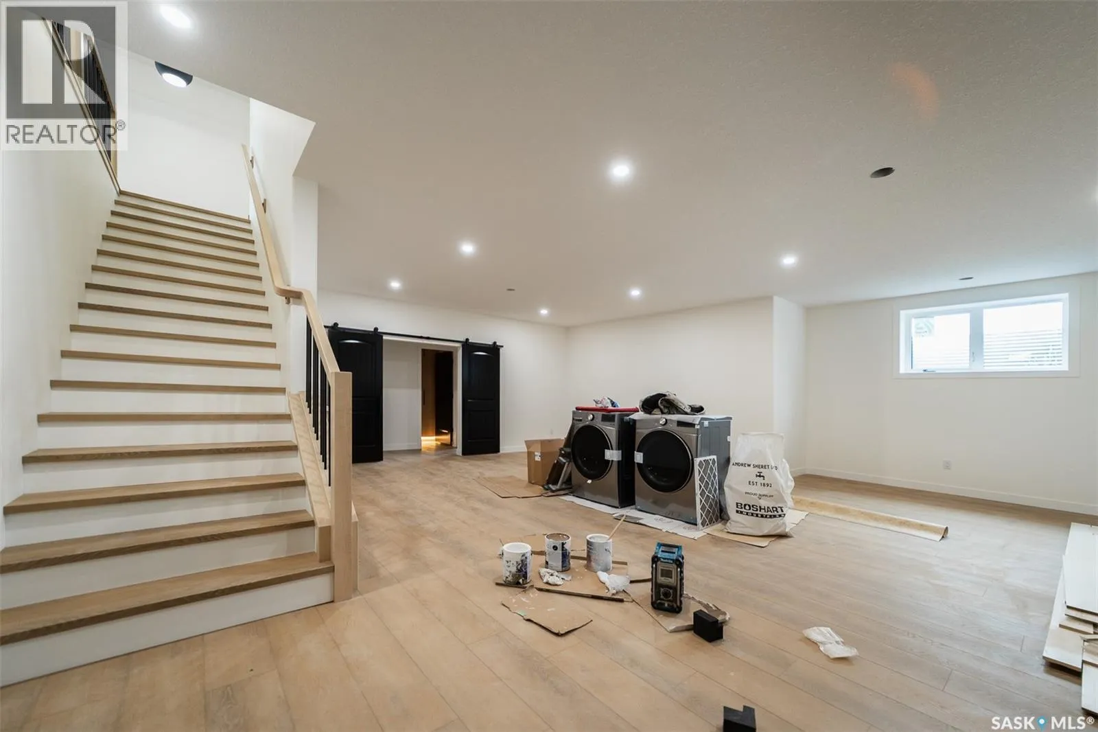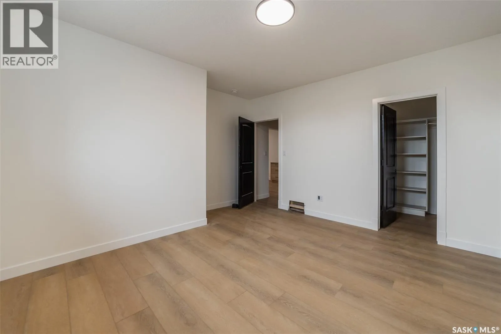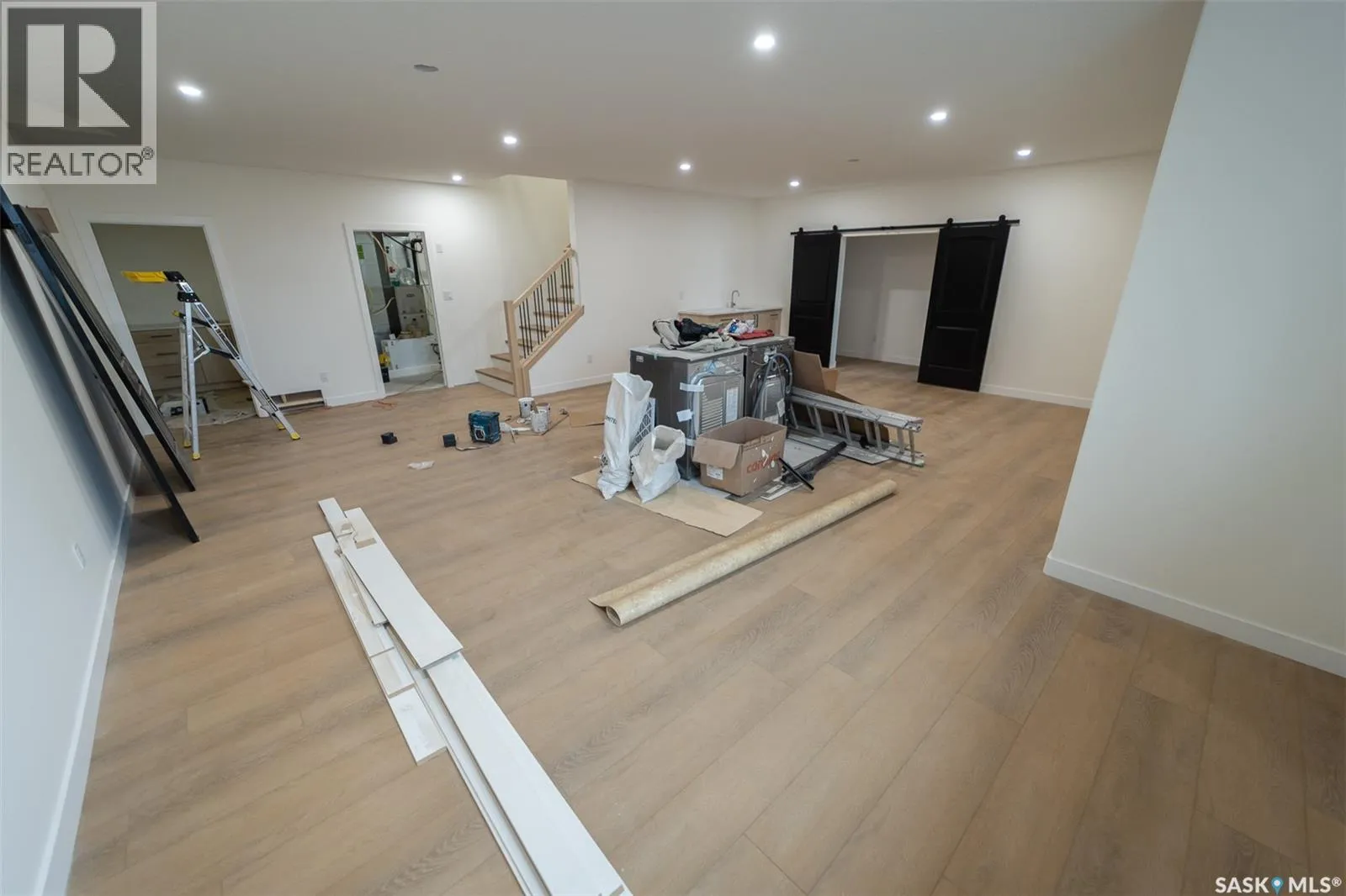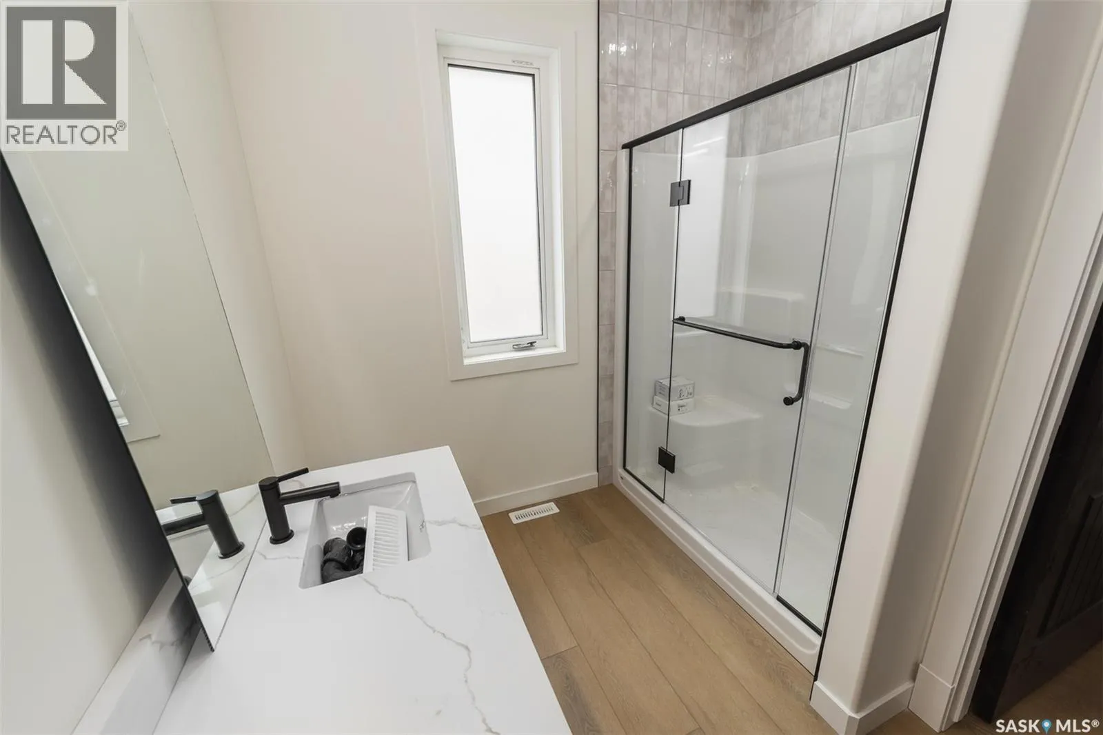 Welcome to this beautiful 1704 sqft custom built home backing green space. Walking and biking paths are at the back of the house and situated only a block away from the new White City School. Home features lots of oversized windows for natural light and has 8-foot-tall interior doors. Features include modern, custom installed hand railing staircase opened to the lower level, a luxurious kitchen with two tone cabinetry and a convenient 9 feet 2 level eat-in island, quartz countertops complemented with ceramic tiled backsplash and an oversized walk-in pantry with lots of storage. The main floor boasts 2 large bedrooms, a main bathroom, large office (that can be used as a bedroom), ensuite bathroom with a makeup station, walk-in closets, large cozy living room with LVP flooring, modern linear gas fireplace, stainless steel appliances in the kitchen. It also has an amazing covered 15'-0" x 12-0" balcony with a French door, waterproof membrane, and a gas BBQ connection. Lower level is fully developed with LVP flooring throughout, spacious recreational room, 2 large bedrooms with a walk-in closet in each bedroom, wet bar, 4pc bath, large laundry room with cabinets and appliances, high efficiency furnace, owned on demand water heater, air conditioning, and air to air. The oversized 3 car garage with 12' ceiling is insulated, boarded, and primed adding both functionality and curb appeal, garage heater, grit interceptor connected to the house drain and black garage doors with glass inserts. The outside of the house is finished with wood grain metal and acrylic stucco. There are also permanent Christmas Gemstone lights built in and included. Some details still need to be finished in the house, seasonal work including any concrete work, driveways etc will be done pending weather conditions. (id:27476)