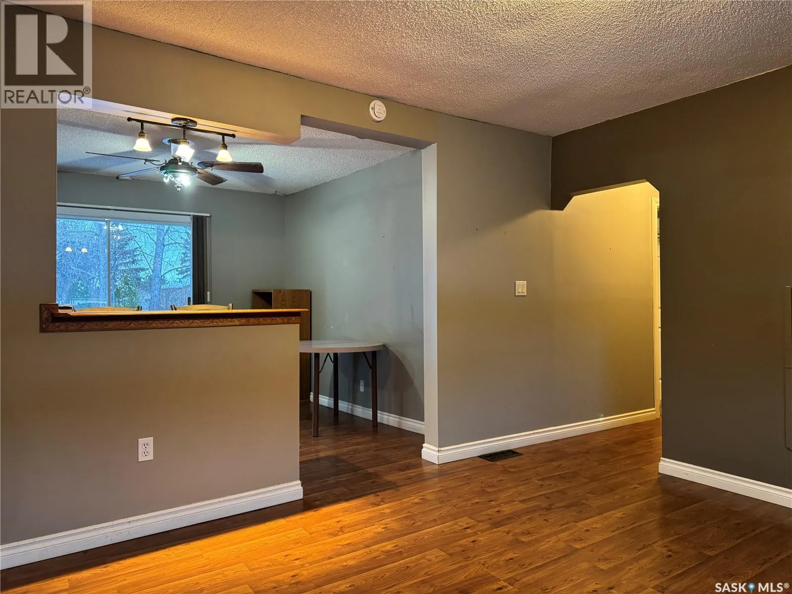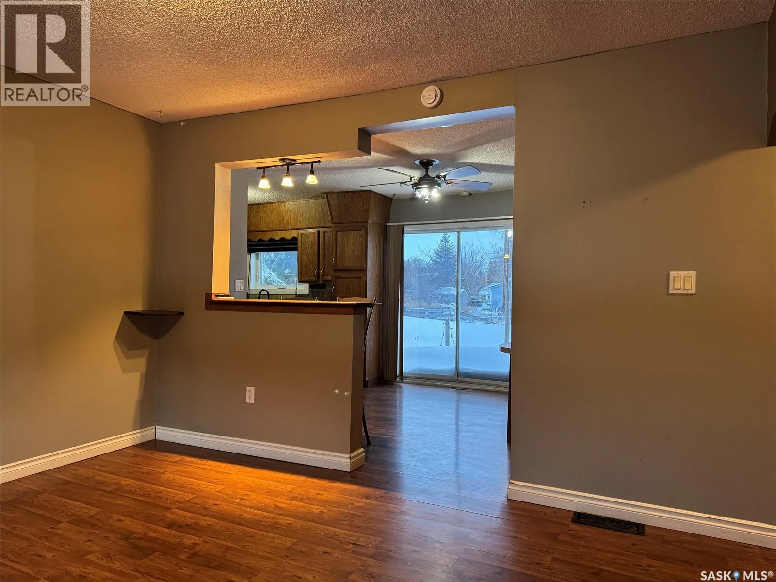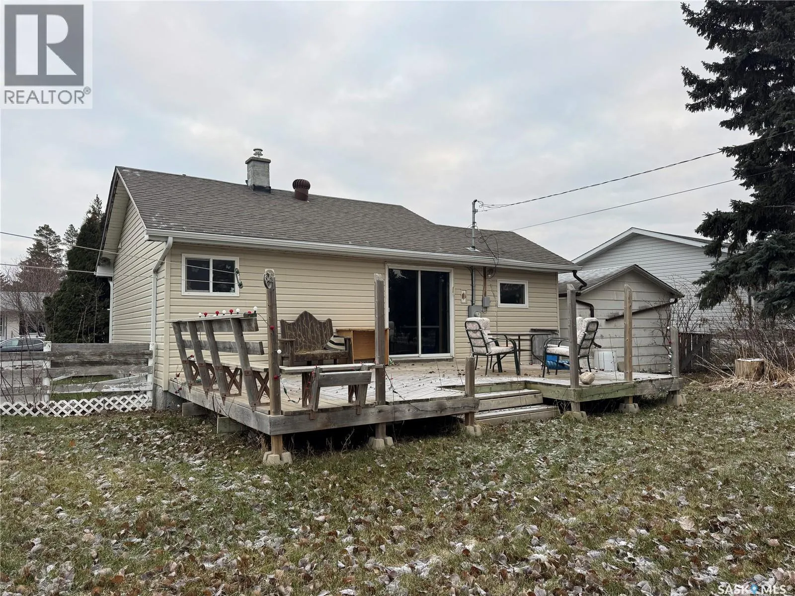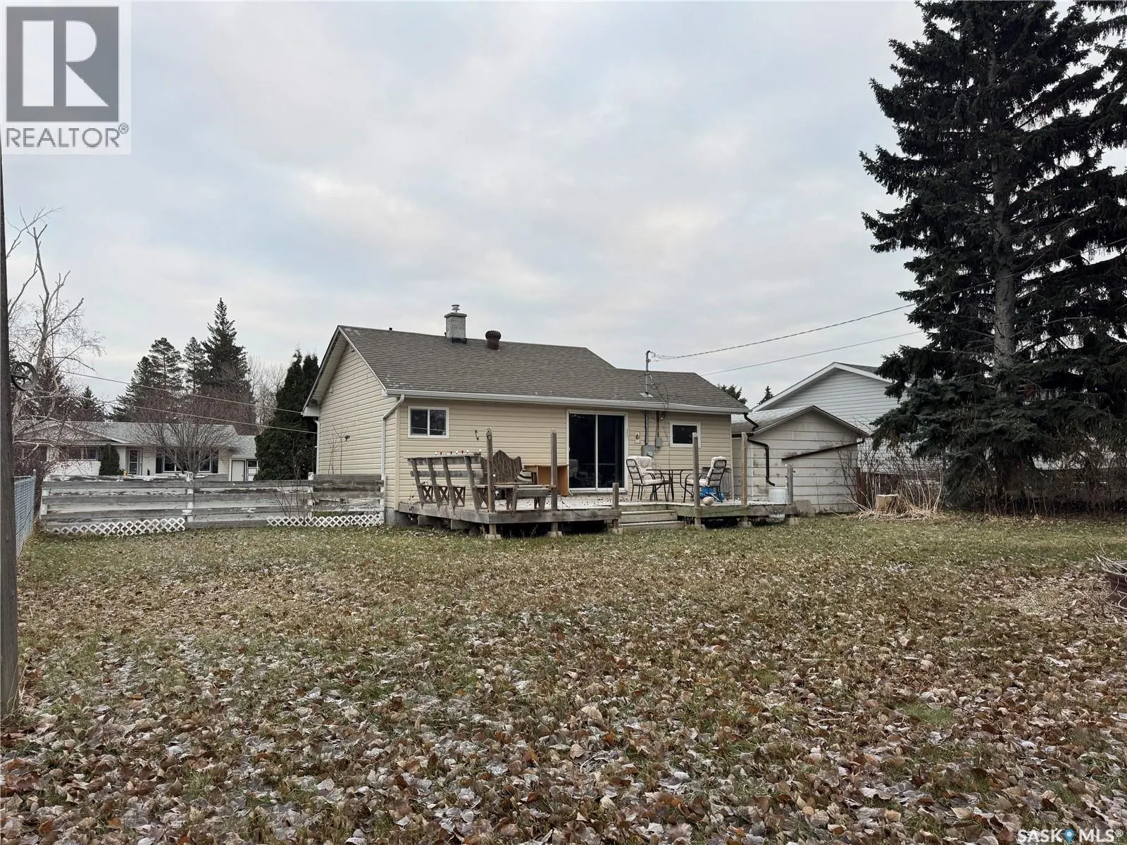 Welcome to this 1-bedroom, 1-bathroom home located in Wynyard on a 75 Ã 120 ft lot. The main floor offers a functional layout with one bedroom, a full bathroom, and an open-concept kitchen, dining, and living room. The dining area provides direct access to a large back deck, adding convenience for everyday use. The basement features a finished living room that offers flexible use, including the potential for a second bedroom. A spacious utility/storage room provides additional room for belongings and mechanical systems. Outside, the property includes a fully fenced yard, fire pit area, mature trees, and a single detached garage, offering privacy, outdoor enjoyment, and convenient parking. (id:27476)