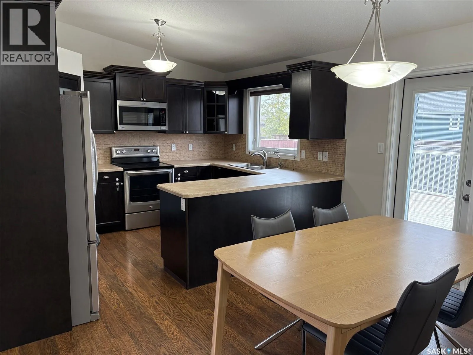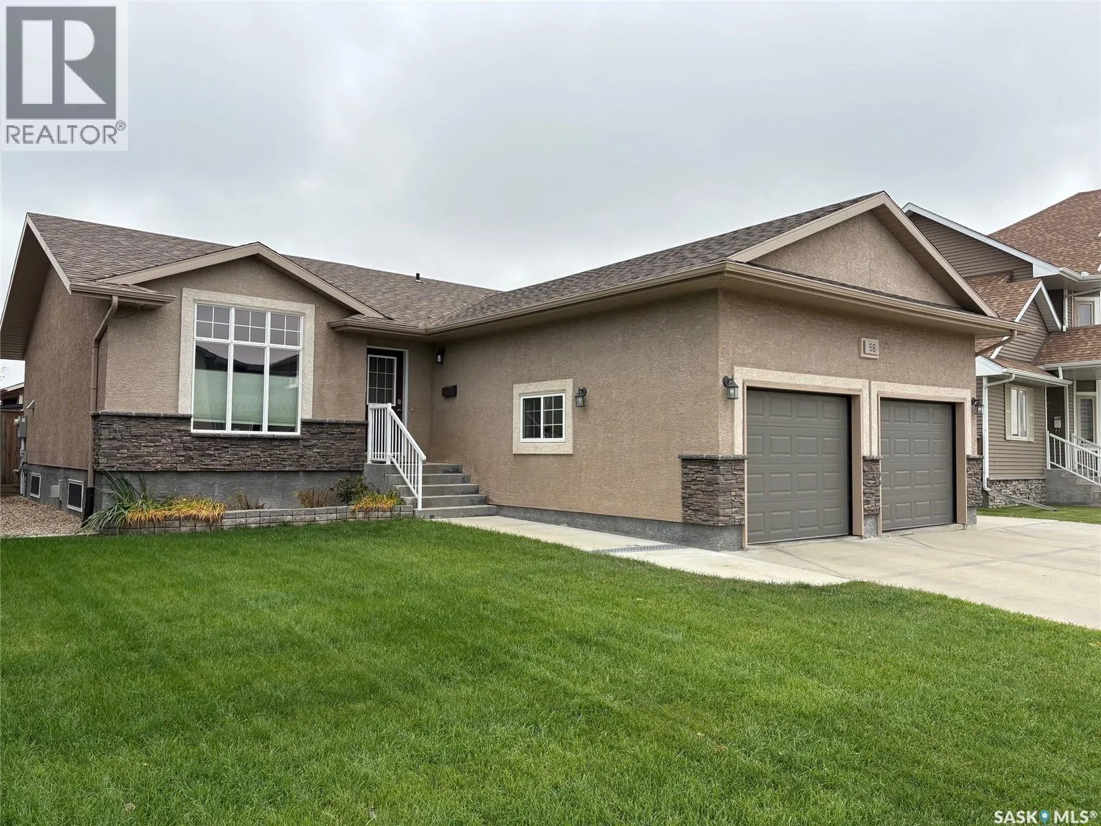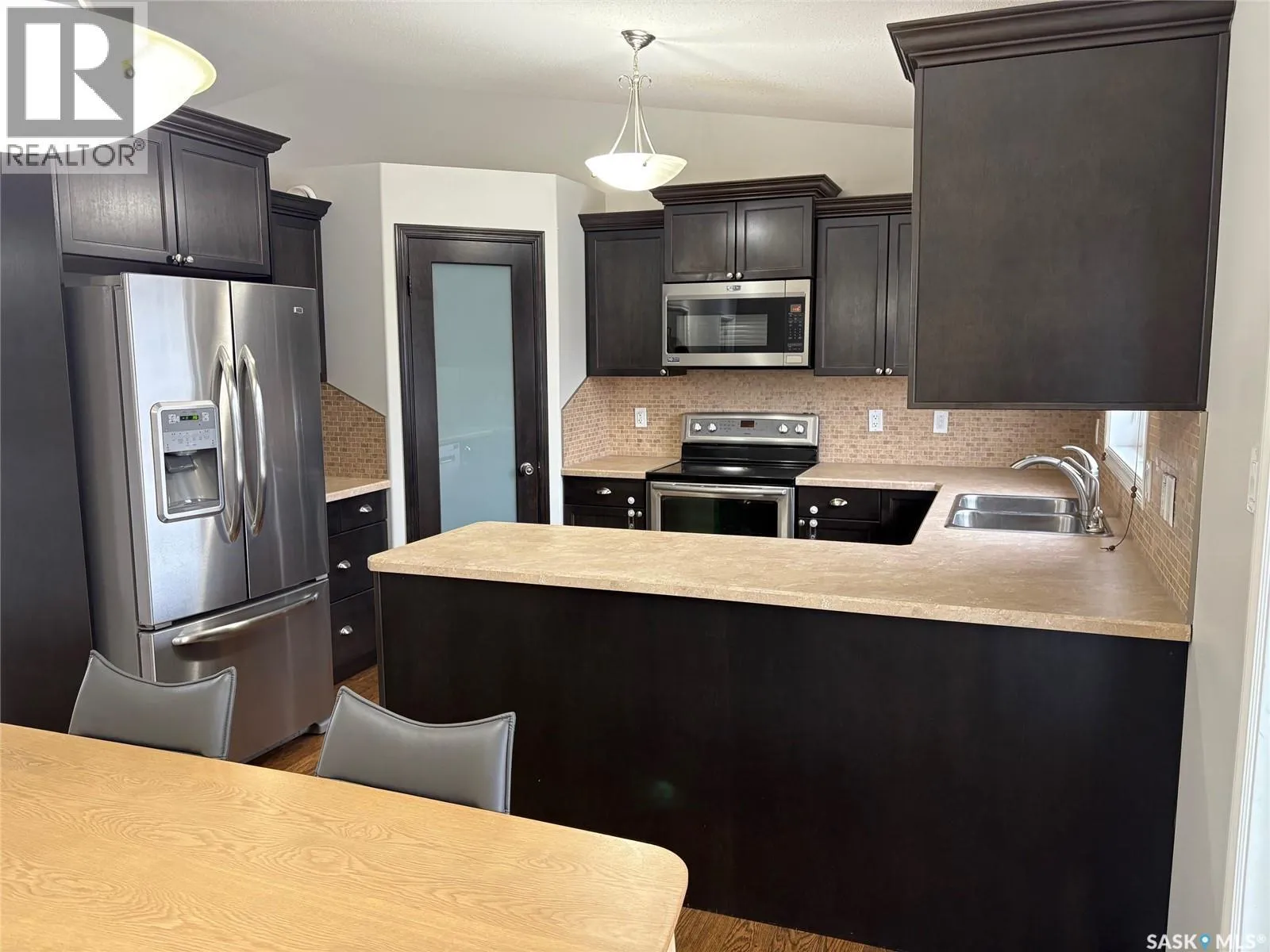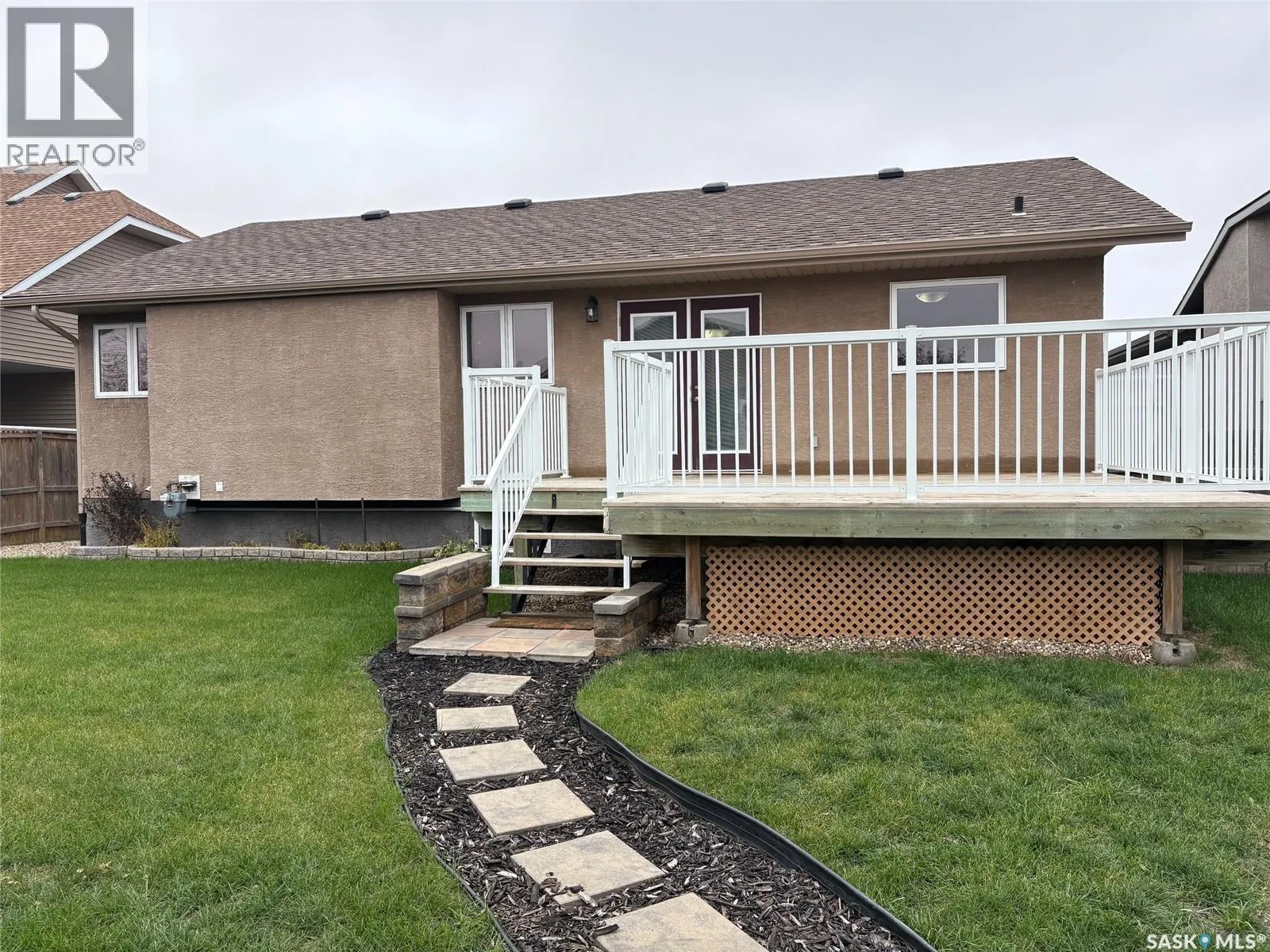 Donât Miss This Stunning Custom Bungalow in Yorktonâs Sought-After Riverside Grove Subdivision! This beautifully maintained 5-bedroom, 3-bathroom home offers 1,338 sq. ft. of bright, open-concept living space designed for comfort, style, and functionality. Step into a dream kitchen featuring espresso-stained maple cabinets, a convenient corner pantry, tile backsplash, and included appliances â ideal for everyday living or entertaining guests. The adjacent dining area opens through garden doors to a west-facing deck, perfect for enjoying sunsets and backyard gatherings. You'll love the thoughtful details throughout: modern light fixtures, rich flooring, and tasteful paint choices that make this home feel like new. The primary bedroom boasts a spacious walk-in closet and a private 3-piece ensuite for your comfort. The fully finished lower level offers even more space with a large family room complete with a cozy gas fireplace, a wet bar, and a designated games area. Youâll also find two large bedrooms, a full bathroom, a den/office space, and ample storage. The utility room is neatly tucked away for convenience. Outside, enjoy the mature, landscaped yard from your large deck with aluminum railings, or take advantage of the oversized driveway and double attached garage. Additional features include central air, central vac, and a fantastic location near parks, walking trails, and all local amenities. This is the perfect move-in-ready home for a growing family in one of Yorktonâs most desirable neighborhoods. As per the Sellerâs direction, all offers will be presented on 10/21/2025 5:00PM. (id:27476)