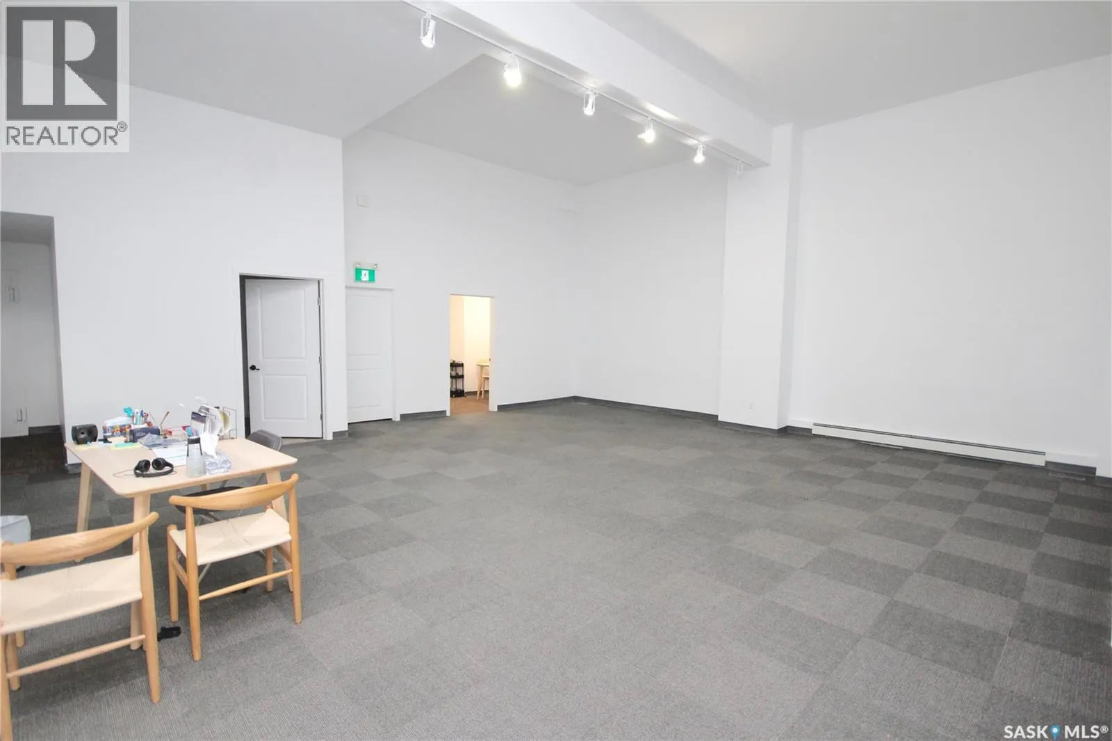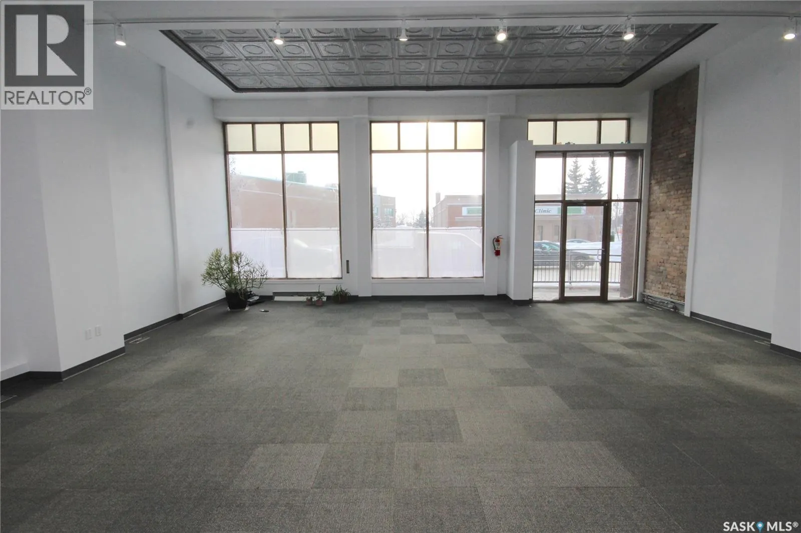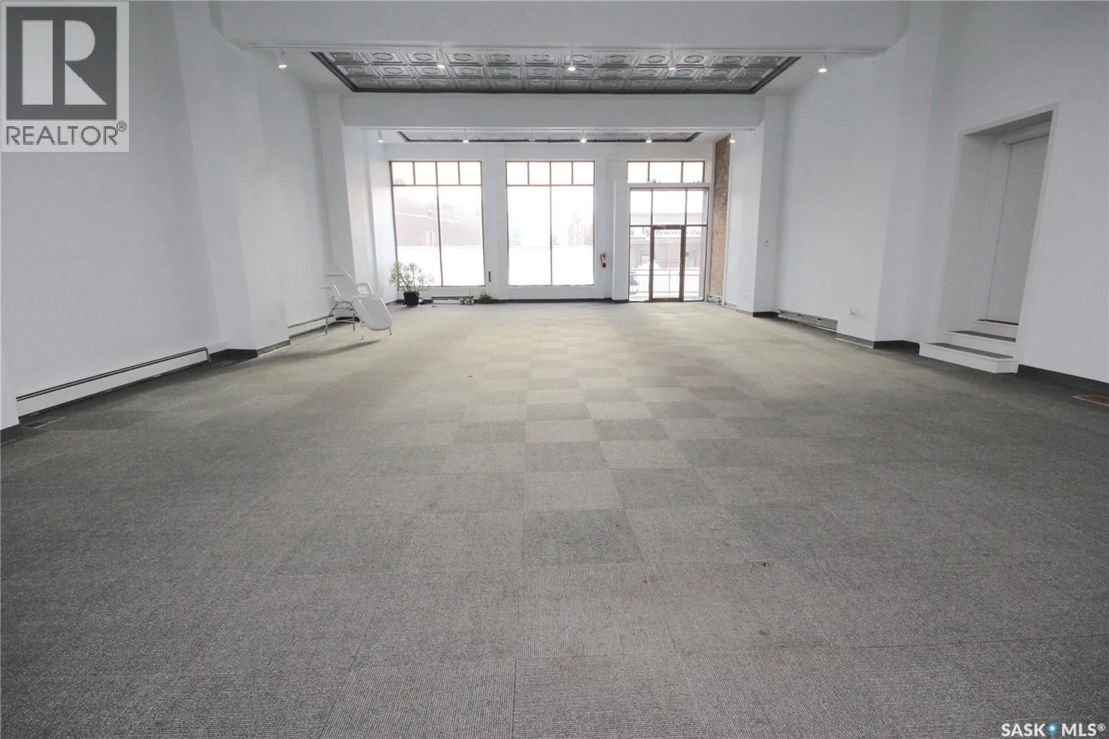 High street traffic, high visibility location This is one of the nicest commercial spaces in the city with 14' ceilings highlighted by beautiful architectural metal panels offering a unique and upscale vibe. The 2500 sq ft open concept space lends itself to a variety of uses from store front space, offices, event space, coffee house, boutique, clinic space, etc. It offers large scale windows facing Broadway St for soothing natural light and high visibility for signage. The front open space is 1628 sq ft with the back area offering 678 sq. ft additional space plus a lunchroom and washroom. There is ample on street parking and public parking lot access across the street. The Landlord has installed new high efficient natural gas forced air heat and central air conditioning for maximum comfort. Note: If you don't need all this space there is an option to lease only the front 1628 sq ft exclusively and sharing the back office/lunchroom/washroom with the Moda clinic staff see MLS SK025948. (id:27476)