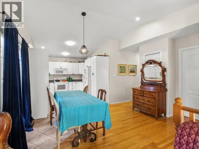 Family home offering 3 bedrooms on upper level and 4th bedroom on the main. Upper level living area with vaulted ceilings and dining area with garden doors to front upper balcony. Kitchen nestled in beside central dining area with white cabinets. Three bedrooms and full bath, ensuite with jacuzzi tub. Main level entry with access to single garage. This level features family room with hardwood flooring and a woodstove nestled in corner sold as is where is. There is a 4th bedroom and room, RI for 3rd bathroom, and laundry/storage are also on this level . Stairs from lower level to upper have a landing with side door that provides access to fully fenced and landscaped yard. (id:27476)